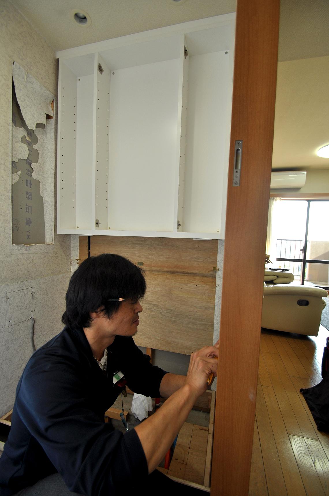 ミラーを撤去した壁面へミラー収納の取り付け。