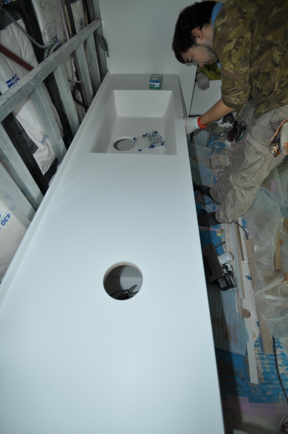 右袖のランドリー収納を納めたら本格的に洗面台へ着手。