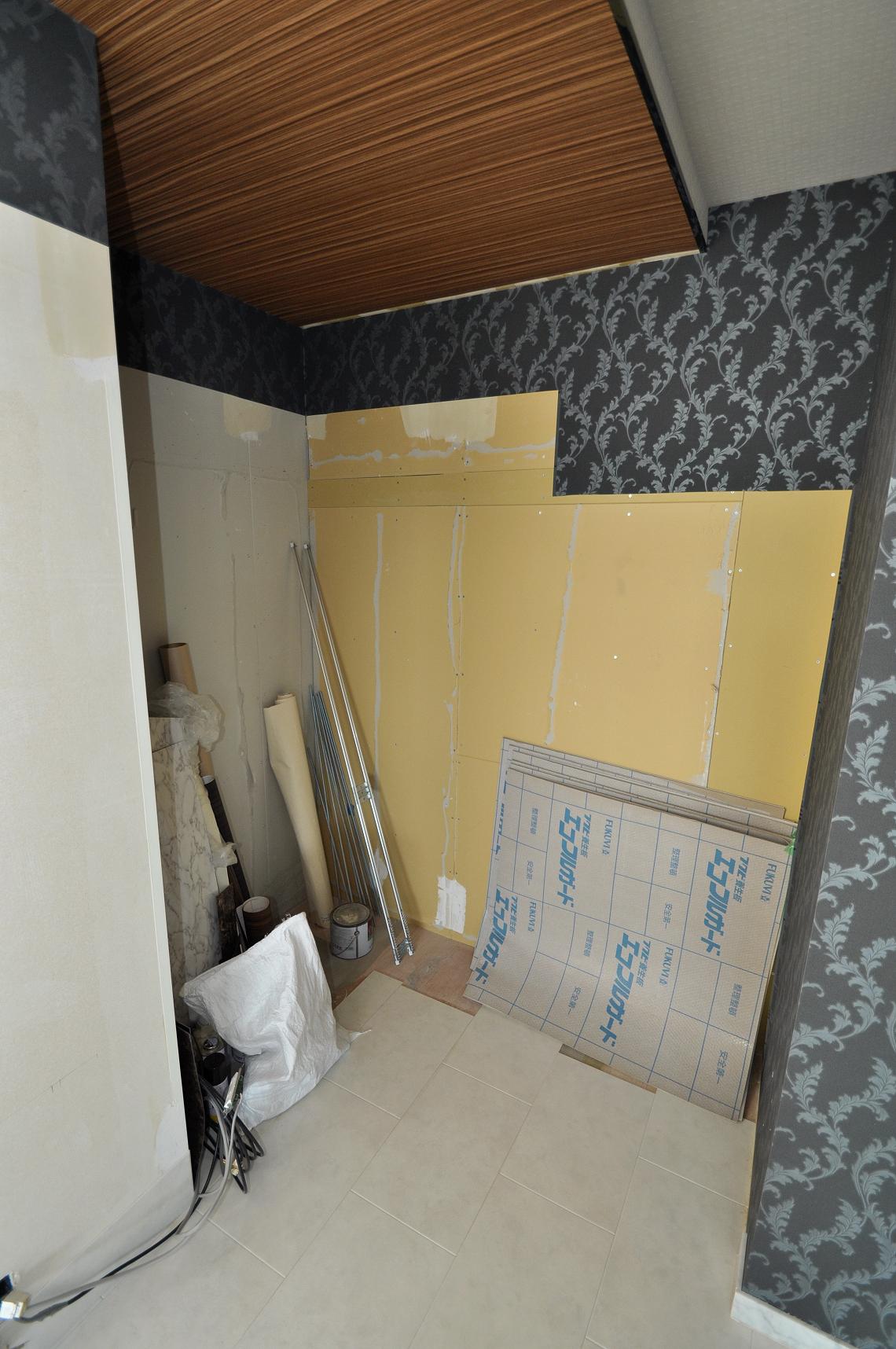 正面長手w6090/mm・短手1860/mmのL型壁面収納を施工してまいります。
