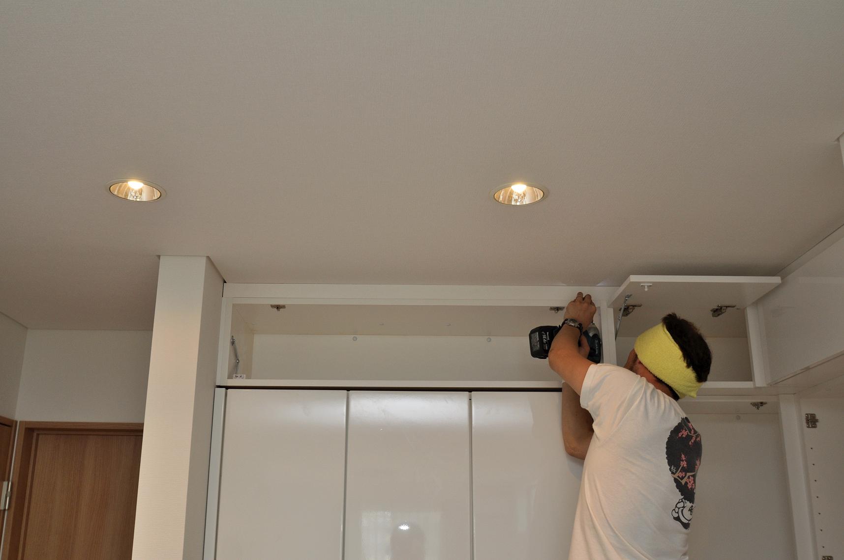 クリーニングと平行して棚板の設置、扉の吊り込み。