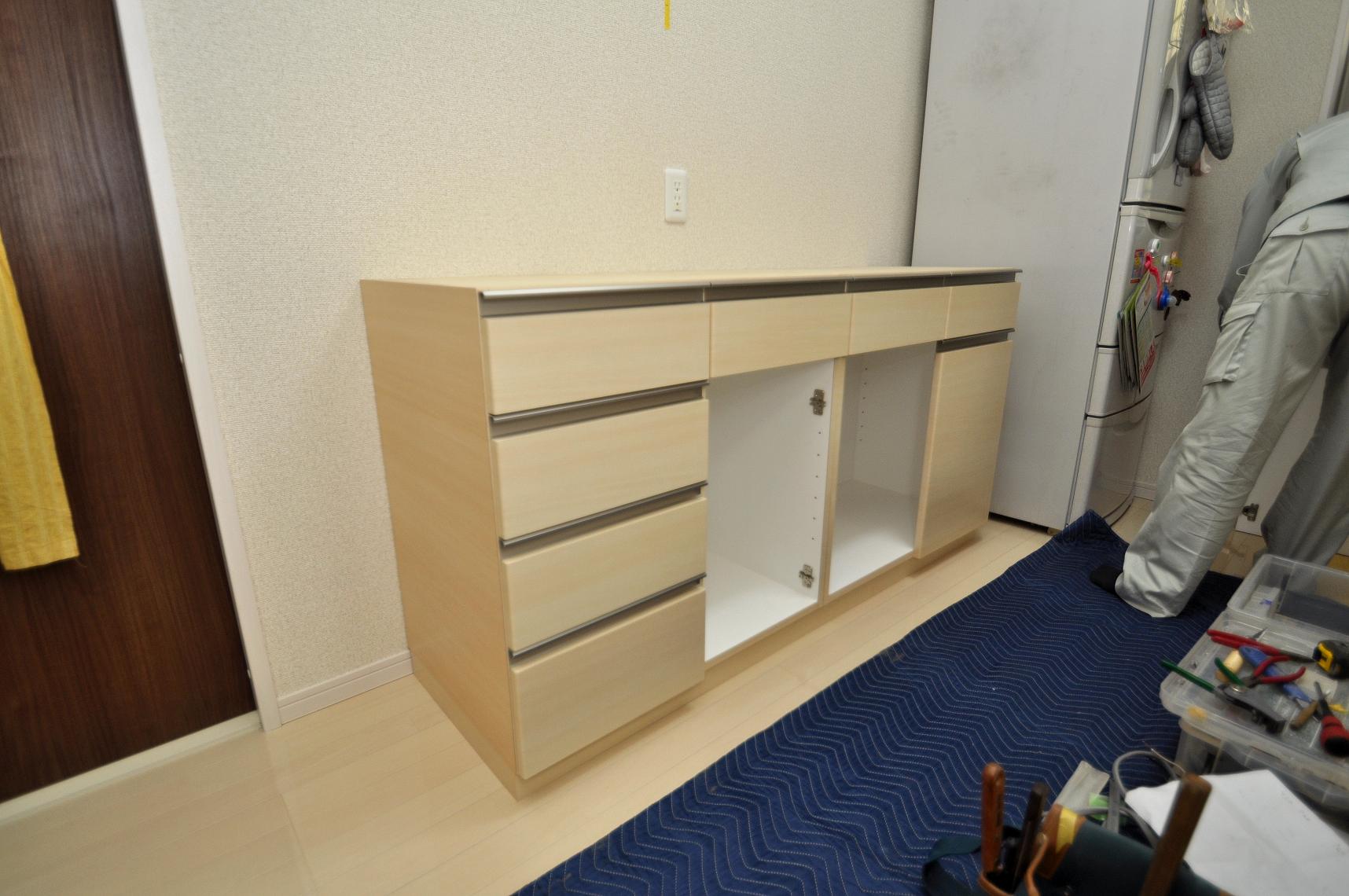 扉・引き出しをはずして連結・固定作業の準備へ。