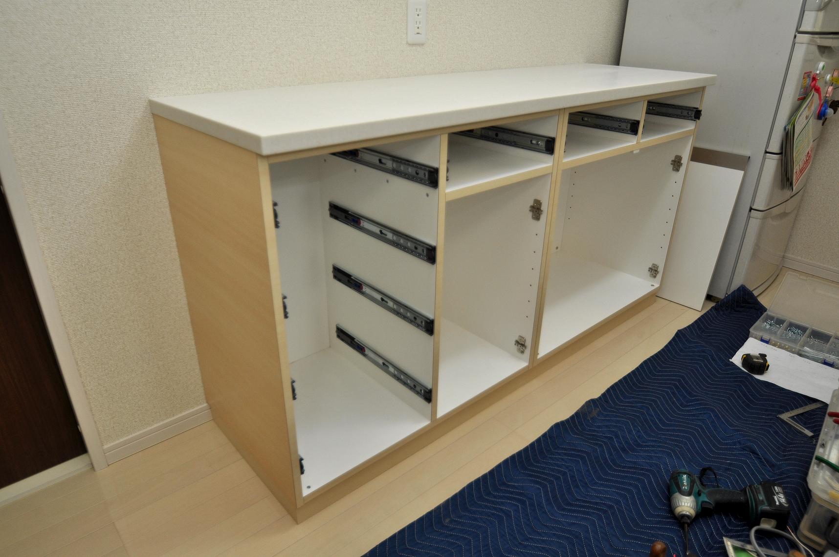 連結を終えたら全ての引き出し・扉をはずして天板との連結準備へ。