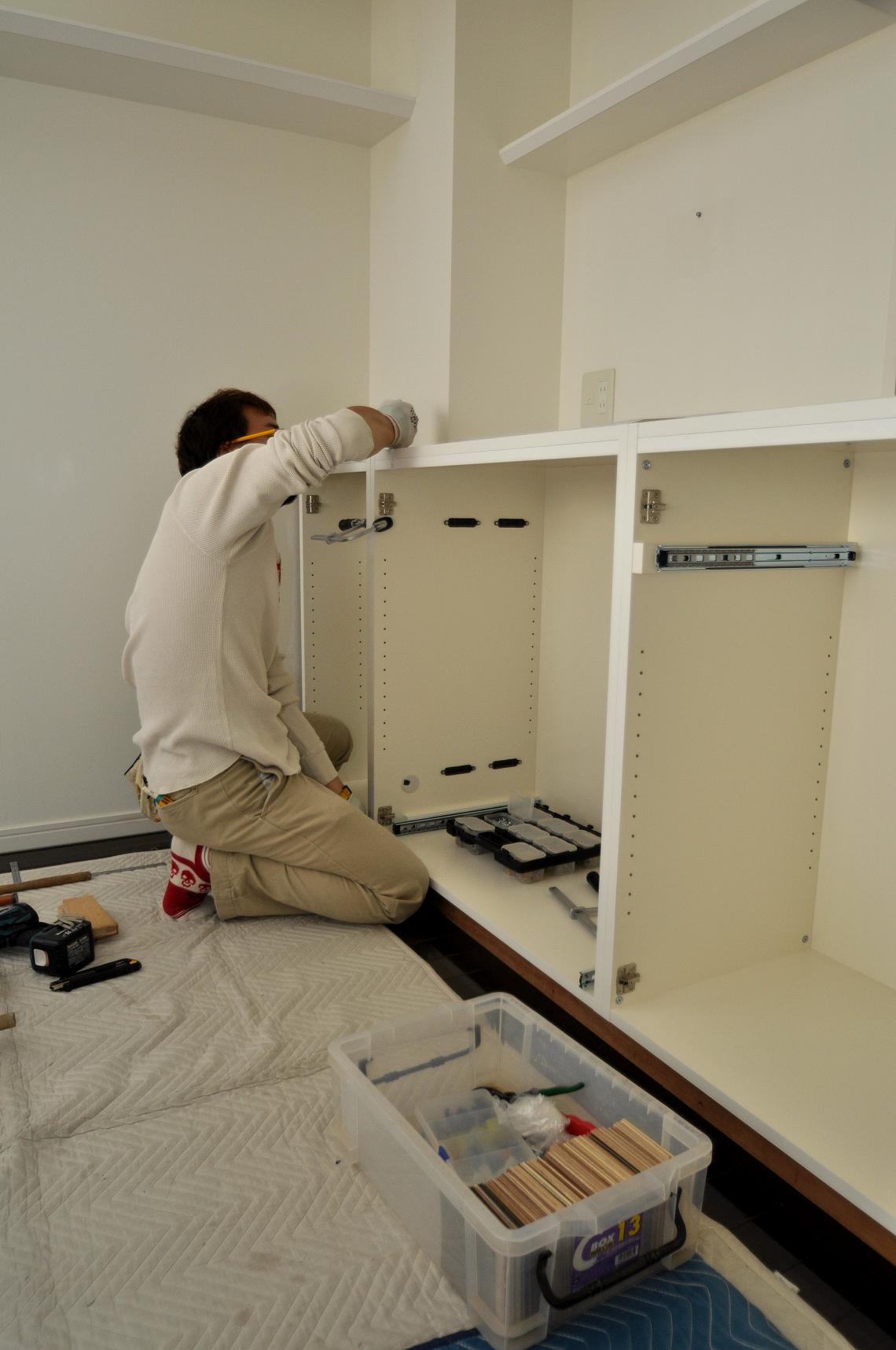 続けて既存天板と壁面下地に向かって収納の固定作業へ。