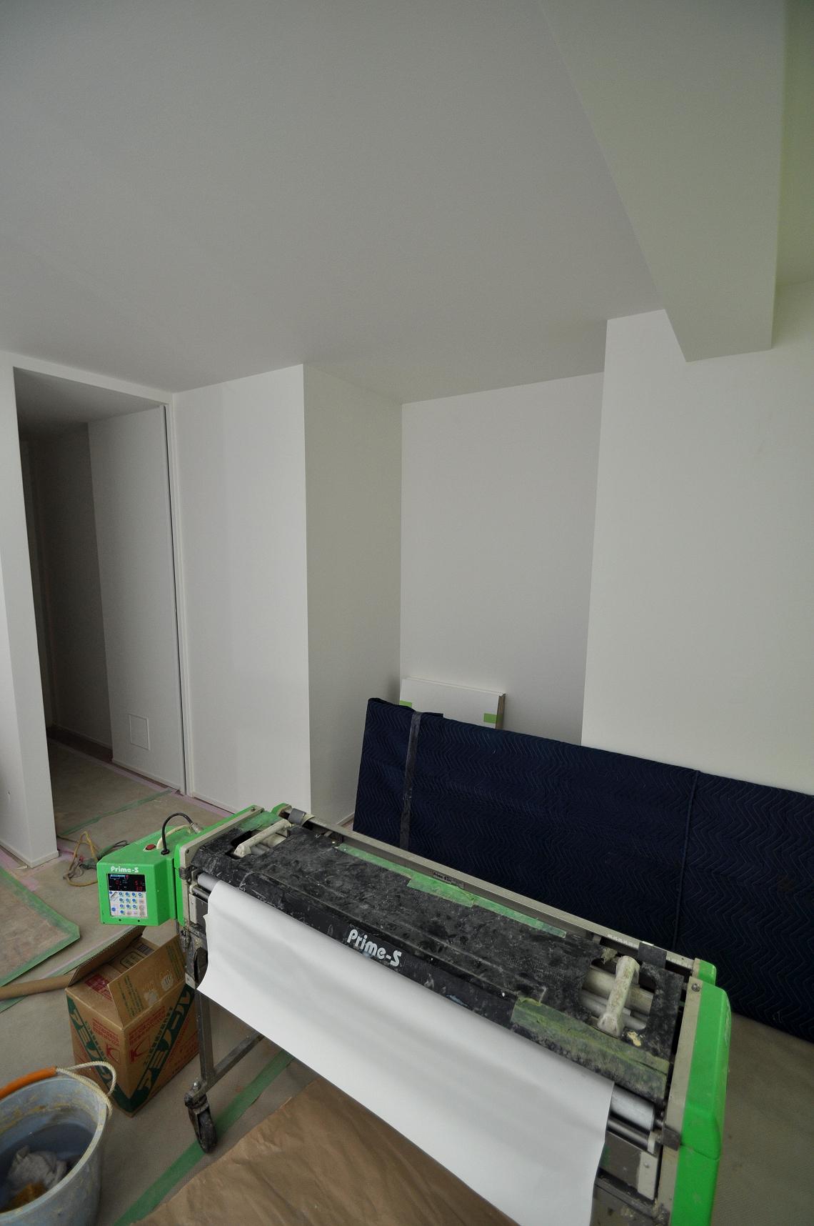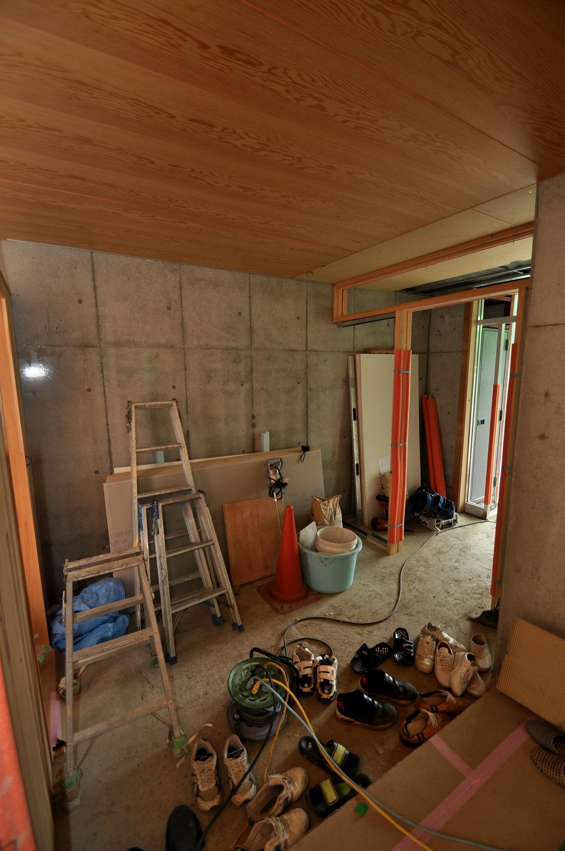 後程ここともう少し入り口付近の風除室にもウォールナットの壁面収納を取り付けます。