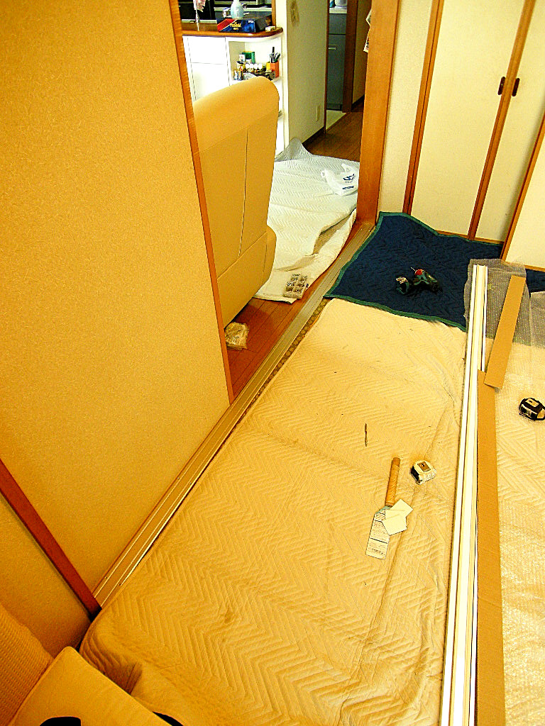 既存の襖を撤去してアルミ製の敷居を新設・鴨居の新設をしてまいります。