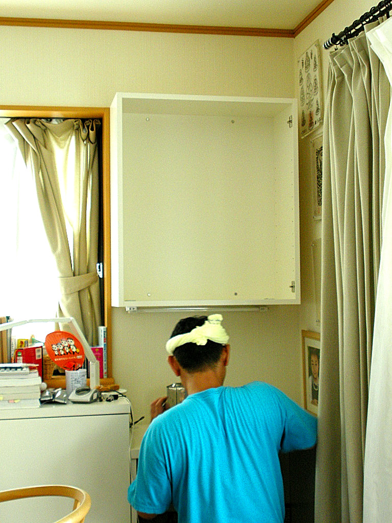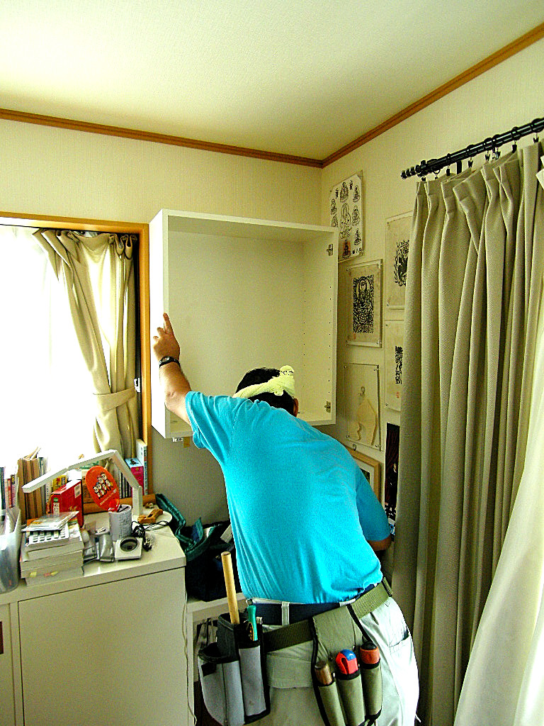 照明のチェック・クリーニング・棚板の設置・扉の吊り込みで完成へ。