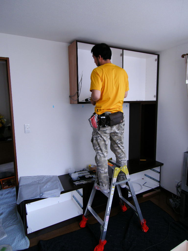 右袖のトール収納と吊棚(右部分)を先行して連結。
