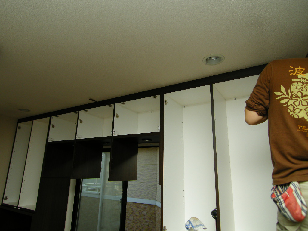 クリーニングと平行して棚板の設置・扉の吊り込みへ。