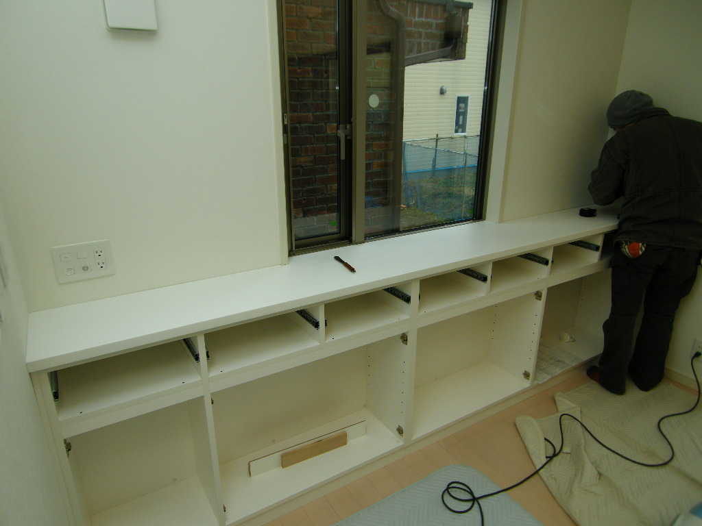 引き出しの取り付けや棚板の設置。