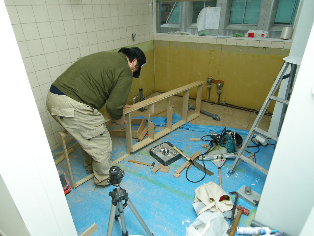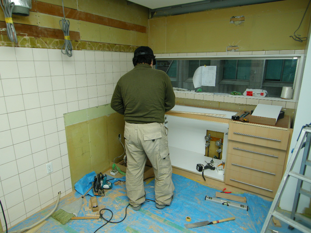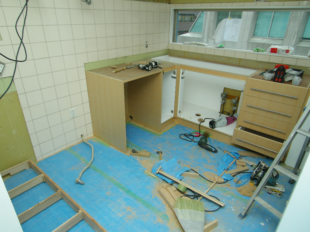 少し掃除をしたら食洗器をビルトインするオープン部分の搬入・仮置き。