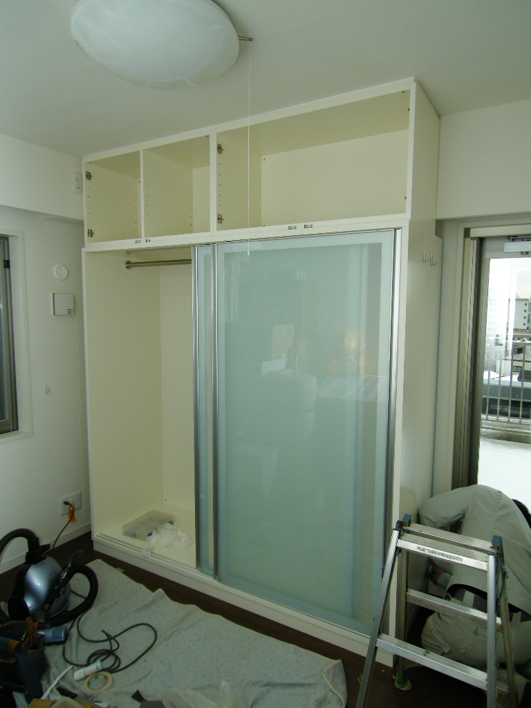ワードローブは残すところ扉の吊り込みと充填作業。