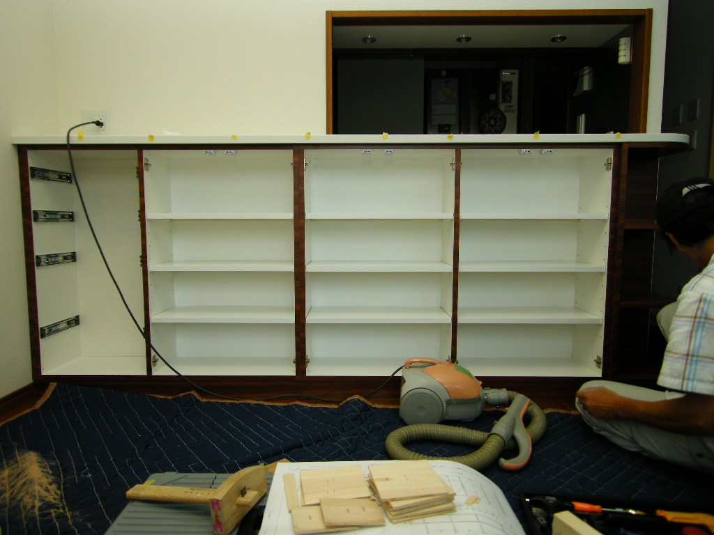 フィラーと台輪(巾木)の取り付けが済んだらクリーニングと平行して棚板を入れていきます。