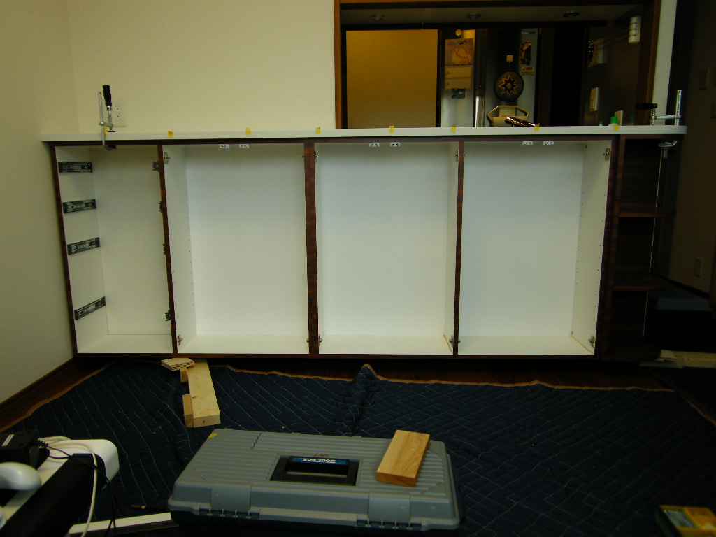 フィラーと台輪(巾木)の取り付けが済んだらクリーニングと平行して棚板を入れていきます。