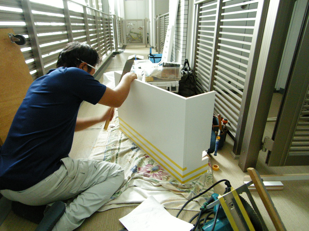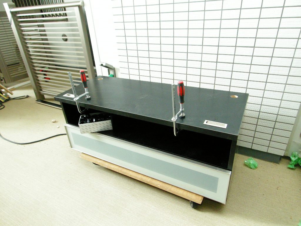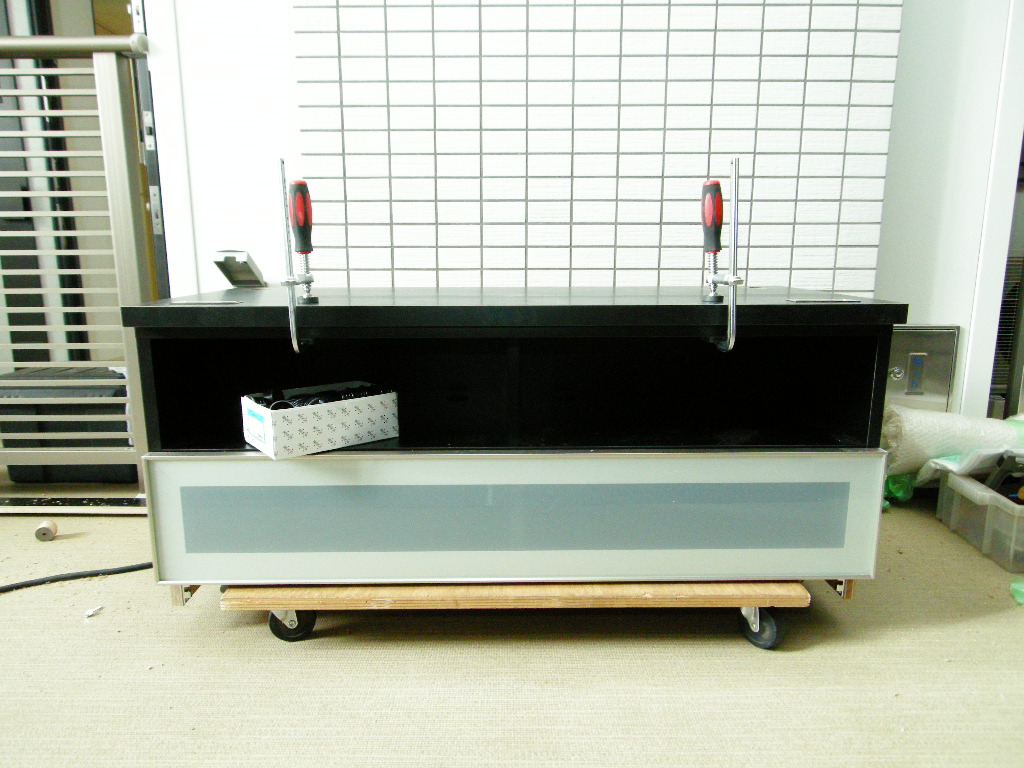本体の埋め木作業と平行しつつAV収納(テレビボード)の組上げ。