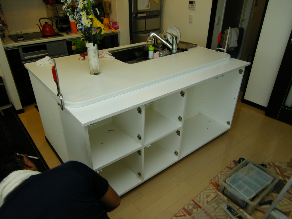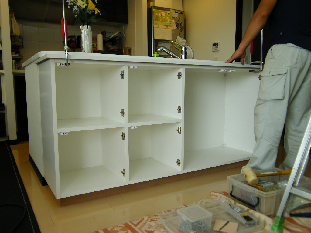 既存のアイランドカウンターに仮止め・固定して行きます。
