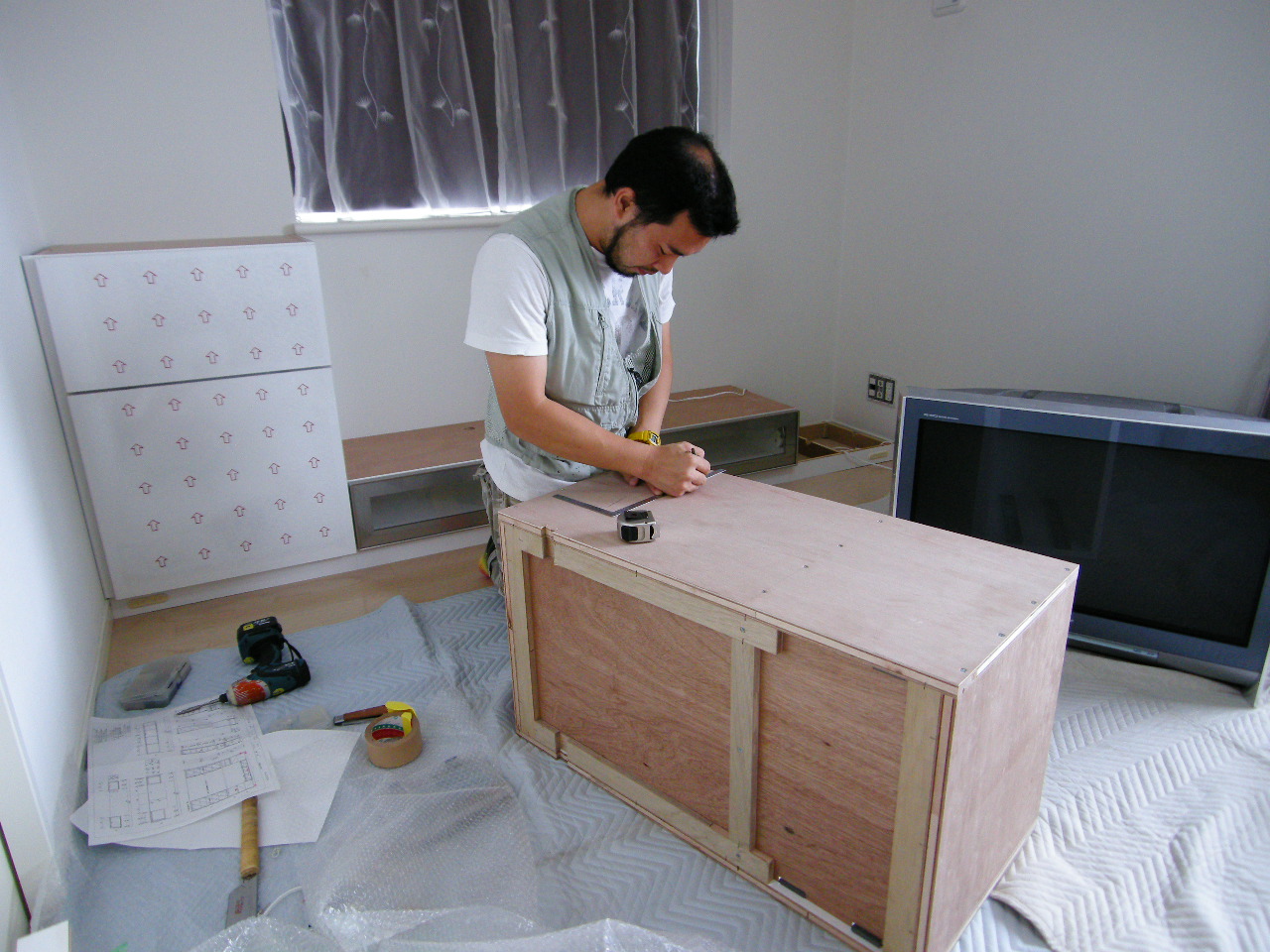 左右の下段収納・センターのAVボードを搬入。