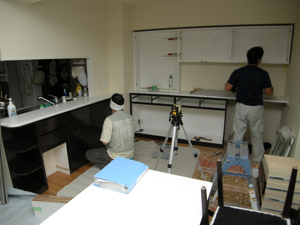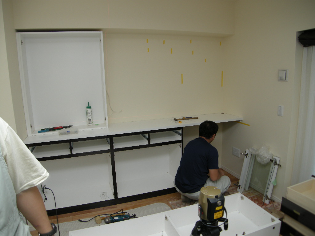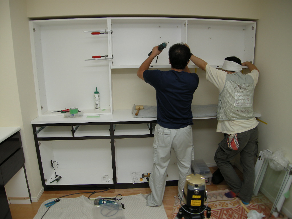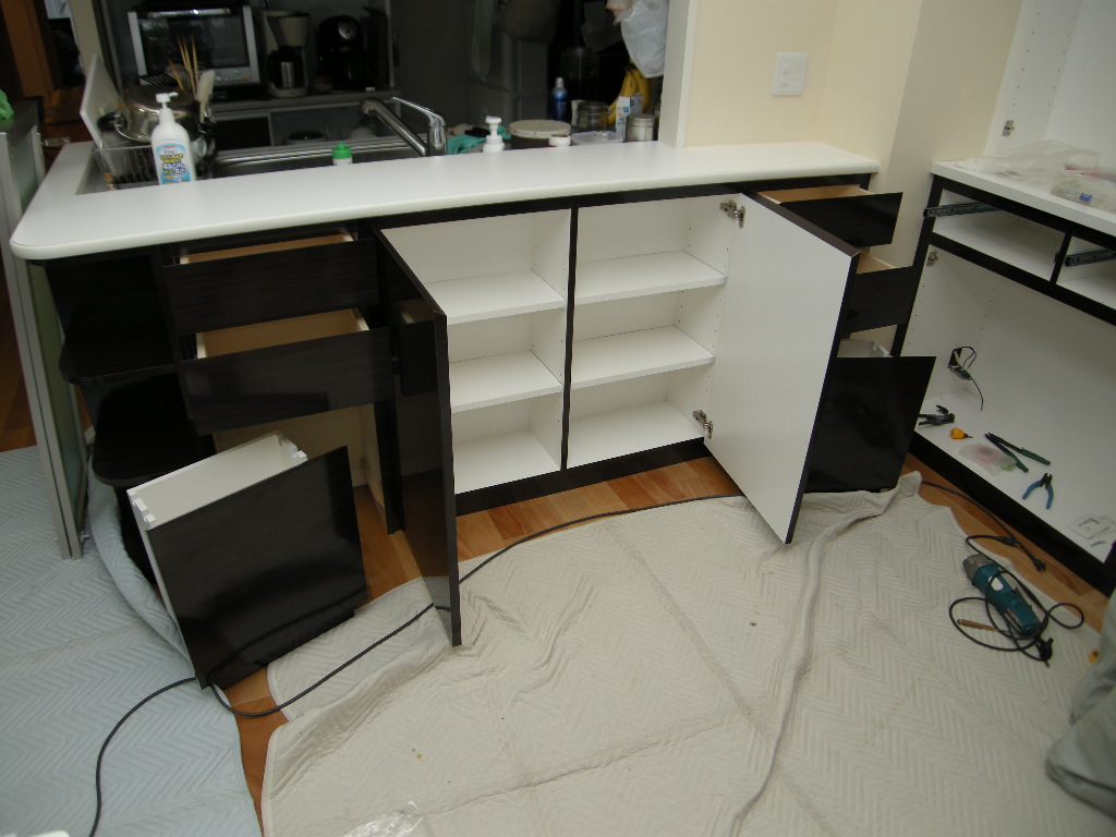 クリーニングと平行して棚板・扉・引き出しを取り付け、調整していきます。