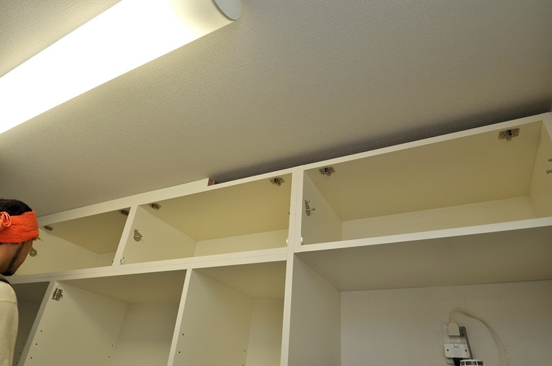 ビスキャップの取り付けや棚板の設置。