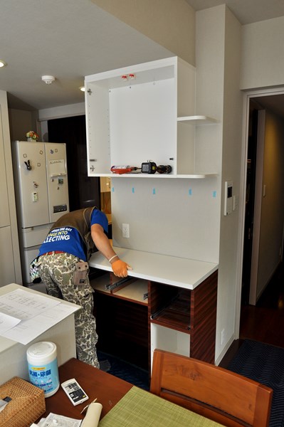 クリーニングと平行しながら抽斗の設置。
