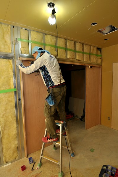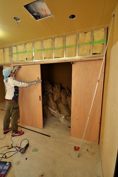 建具の吊り込みからガイドピンの取り付け作業へ。