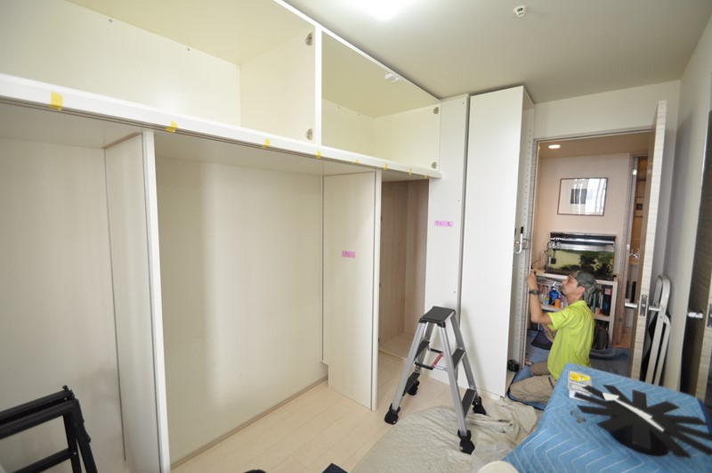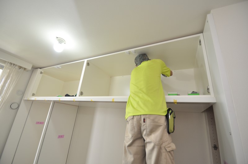 支輪施工などの仕上を残し、OPEN収納(本棚)の固定作業へ。
