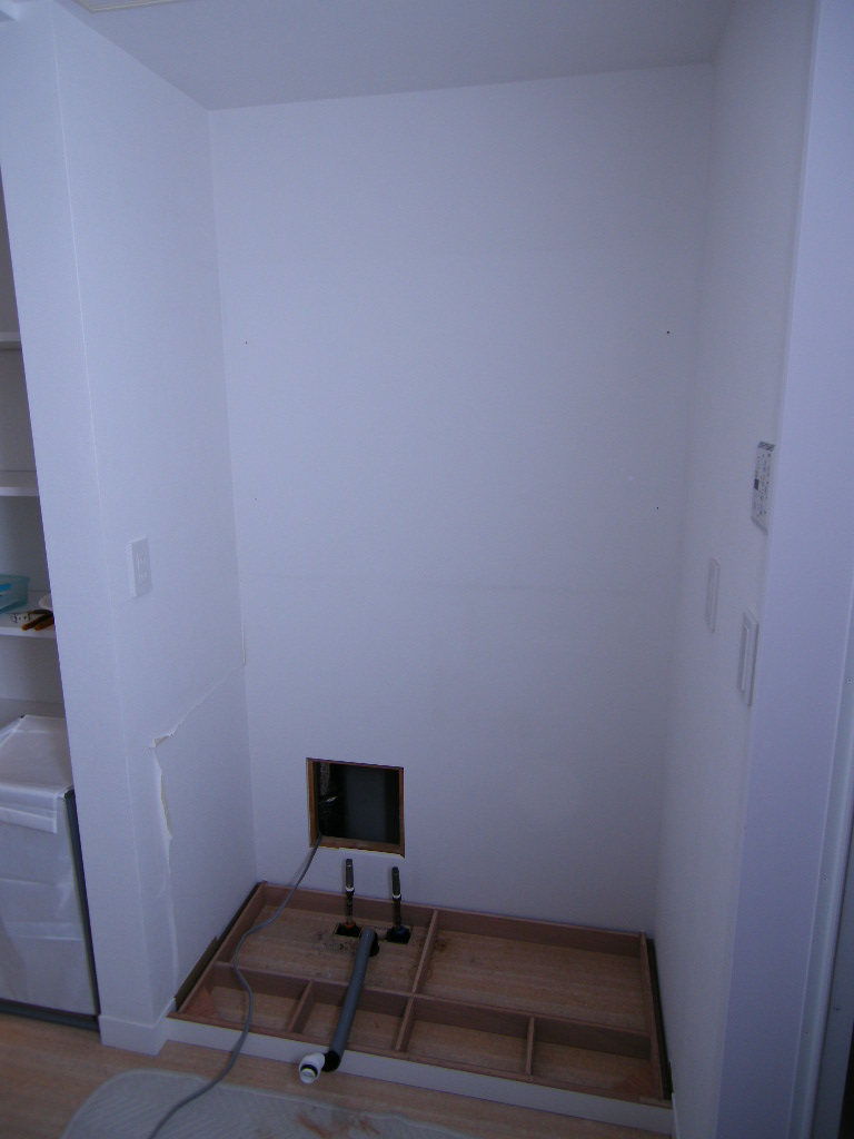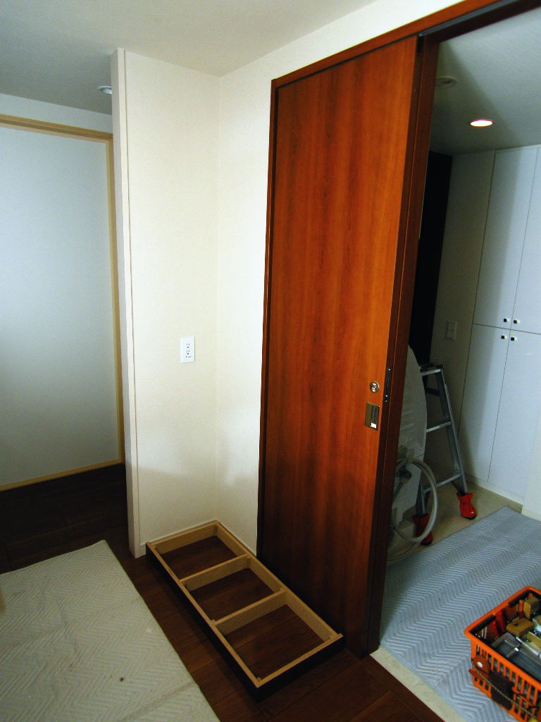 本日から数回に分けて掲載していくのはカップボード(キッチン壁面収納)。同時にオーダー頂いたリネン庫の取り付け状況もUPしてまいります。まずは取り付け前の現場画像から。この壁面が今回のキッチン収納取り付け場所。引き戸が絡んでくるタイプの現場です。替わってこちら...