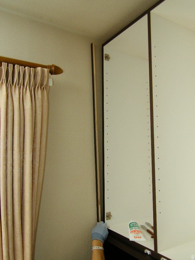 本日の東京は快晴。夏です。数回にわたって掲載してきたH邸リビングボード。本日で最終回です。H様、本当にお待たせしてしまい申し訳ありません(汗)前回からの続きをUPしてまいります。左袖にフィラーの取り付け。仮止めにヘラを挿してあります(笑)続けて支輪(幕板)の取り...
