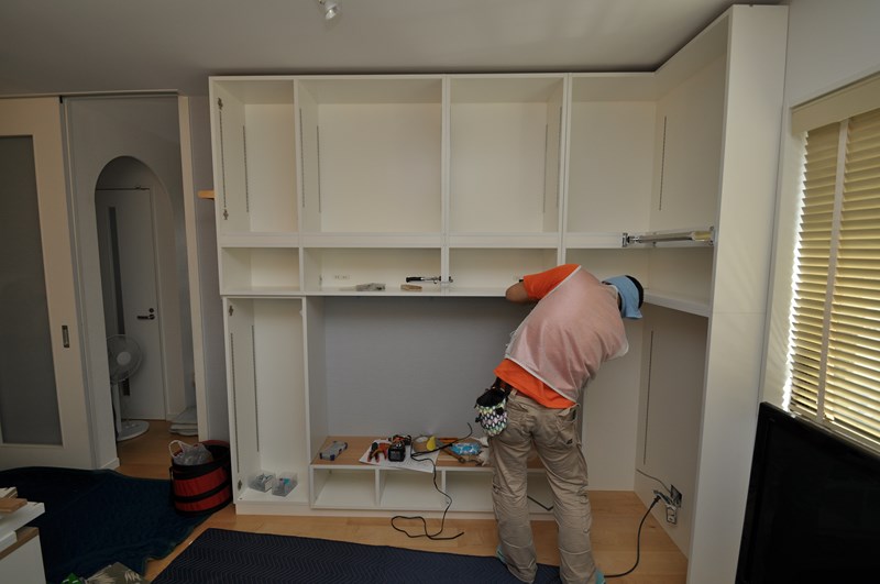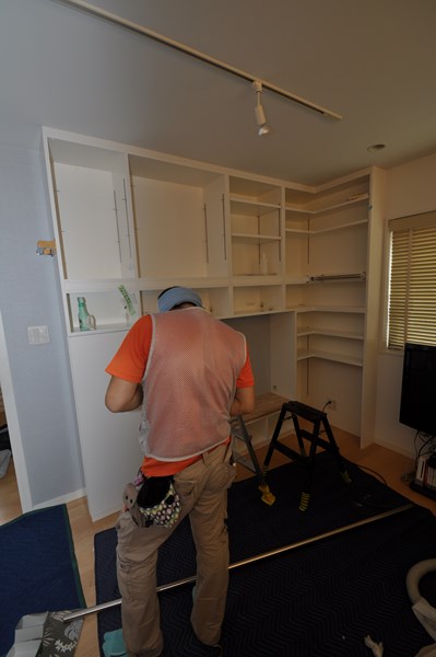 おはようございますw本日からレポートさせていただくのは棚板。一般的な実組みの棚板施工から照明を組んだ特殊な棚板まで、2回に分けてレポートさせていただきます(´・∀・`)ノシまずはTVボード上に施工したものからご覧下さいw 正面左側の壁面が施工箇所。まずは施工前...