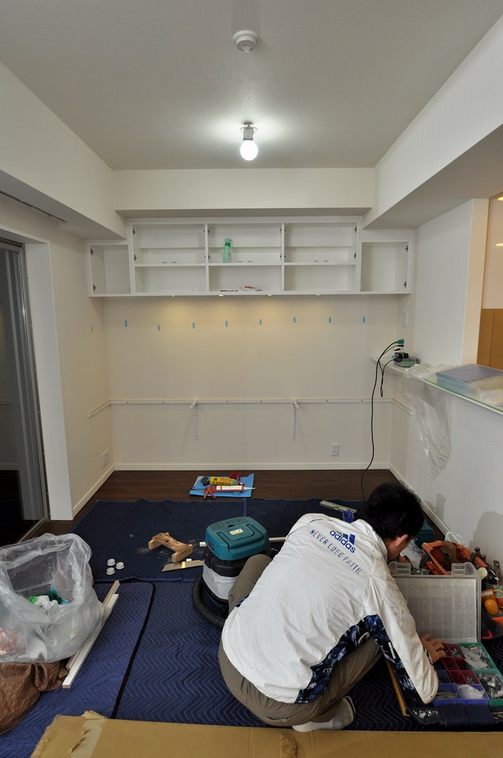いいお天気で、何だか暑いくらいですw夕方には雨になるのでしょうか?やっぱり天気が良いと、気持ちも上がりますね~(´▽`)さて、前回からUPさせていただいているデスク収納、本日は収納部分の施工をレポートしていきますwまずは電気関係の仕込み作業から。吊収納部分の間...