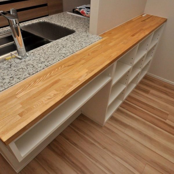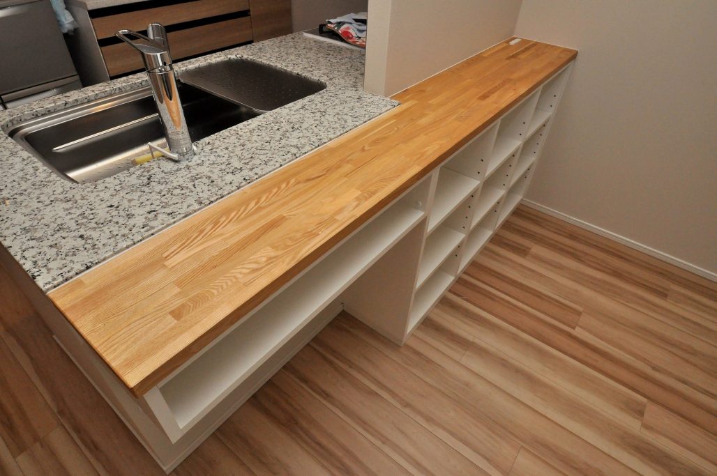 実装の天然石カウンターの延長として、無垢集成材をご採用いただいたところも特徴といえそうです。