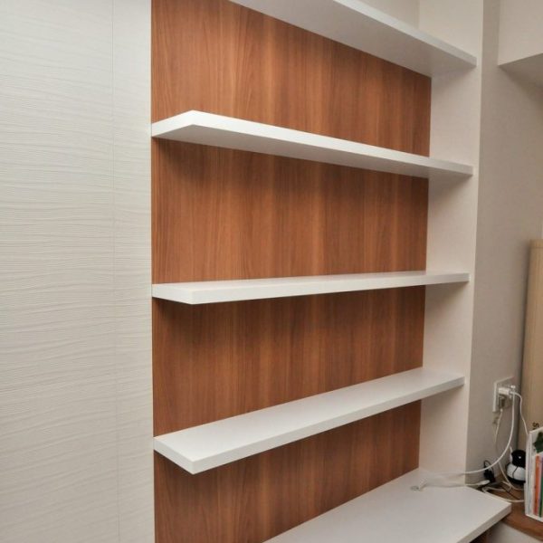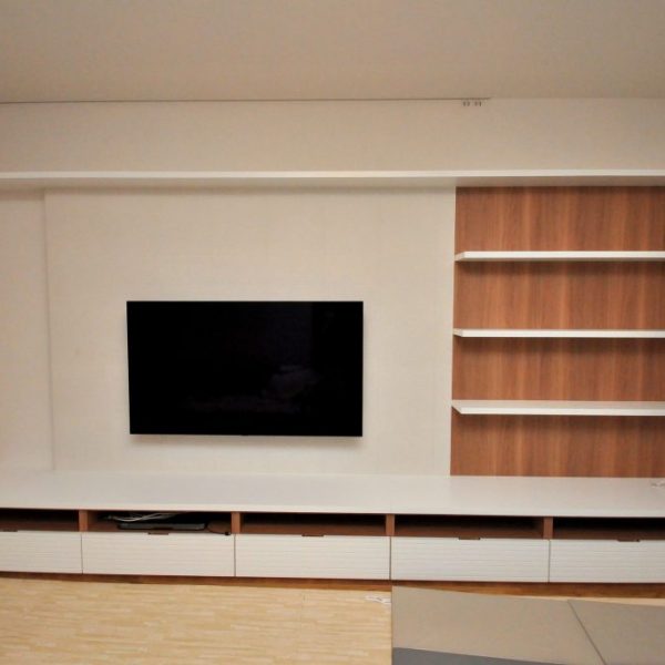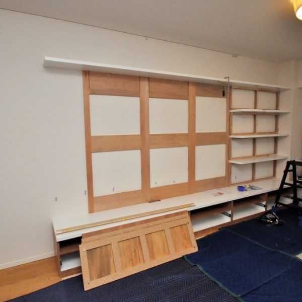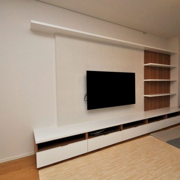実装のマルチメディアコンセントが施工位置から離れていたことから、基本的には有線引き込み式の壁面収納となります。
