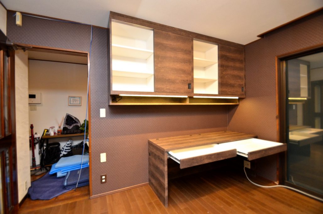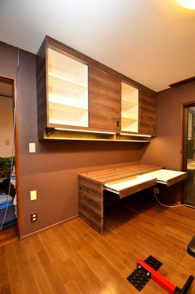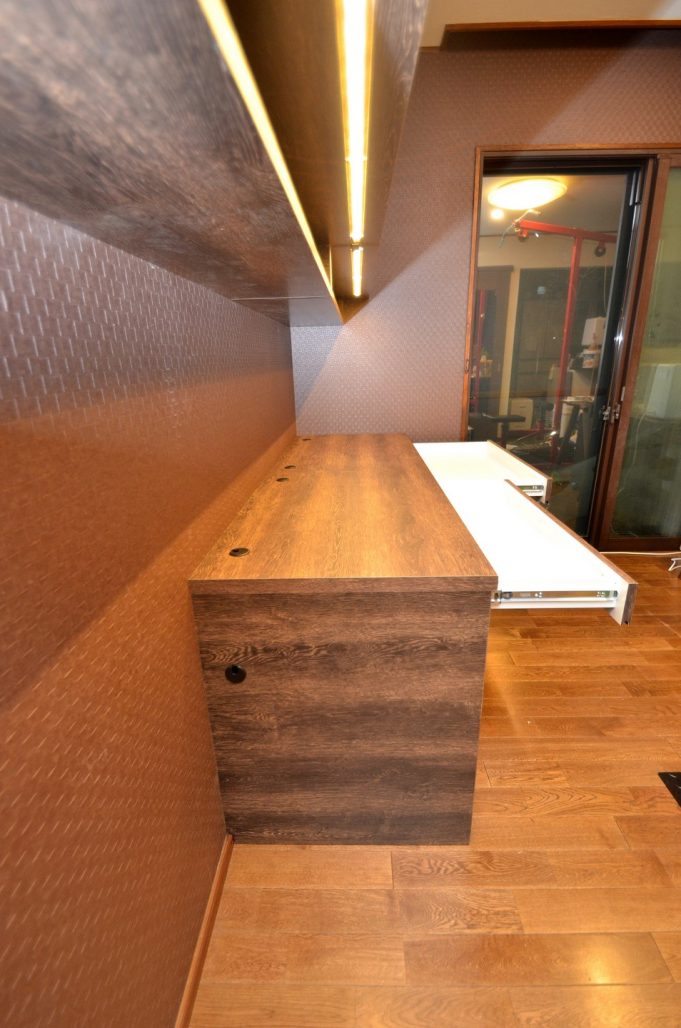 ご注文の内容は、造作デスクと吊式の壁面収納を連動させたオフィススペース。