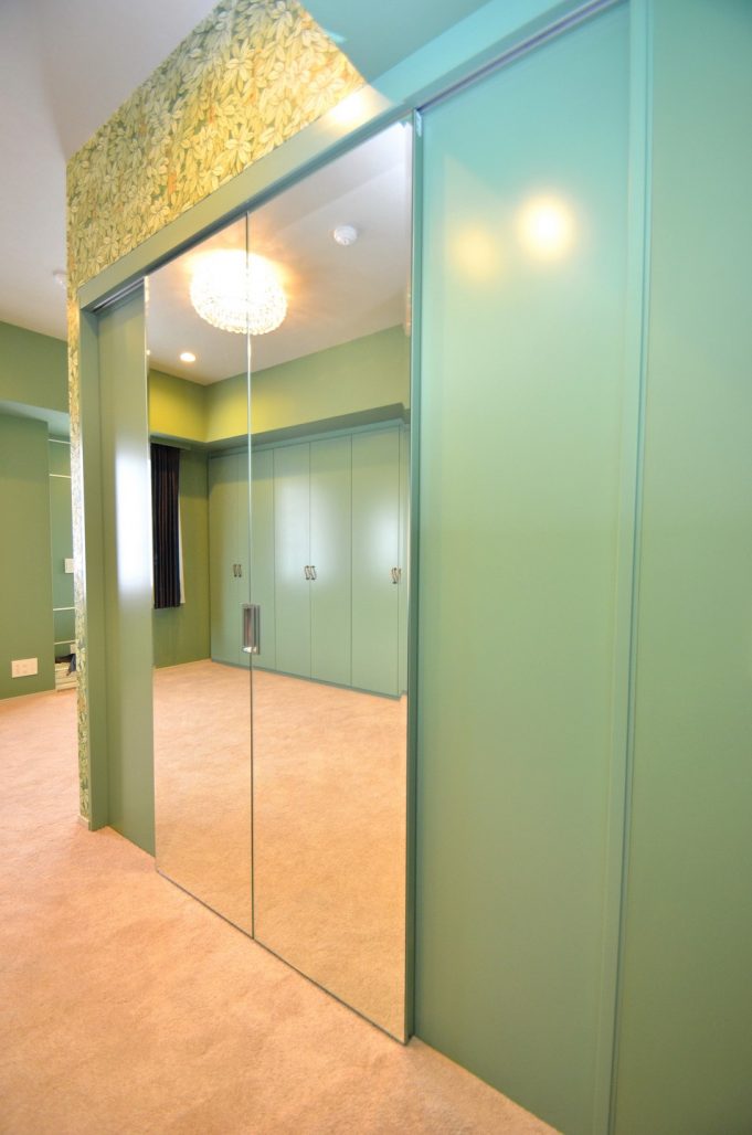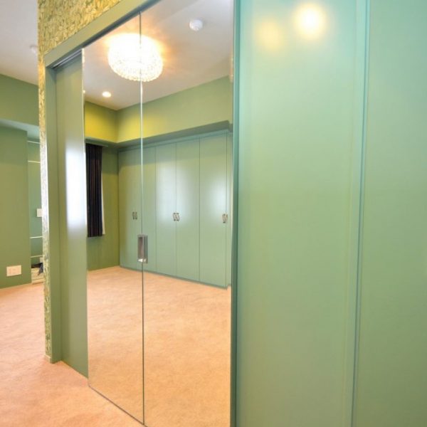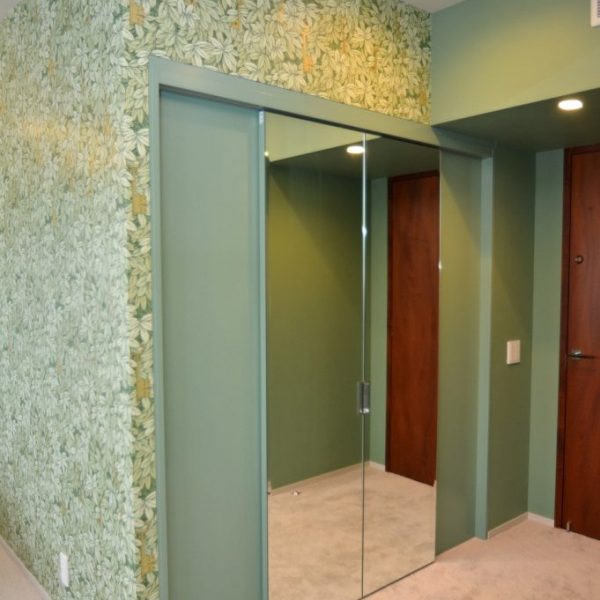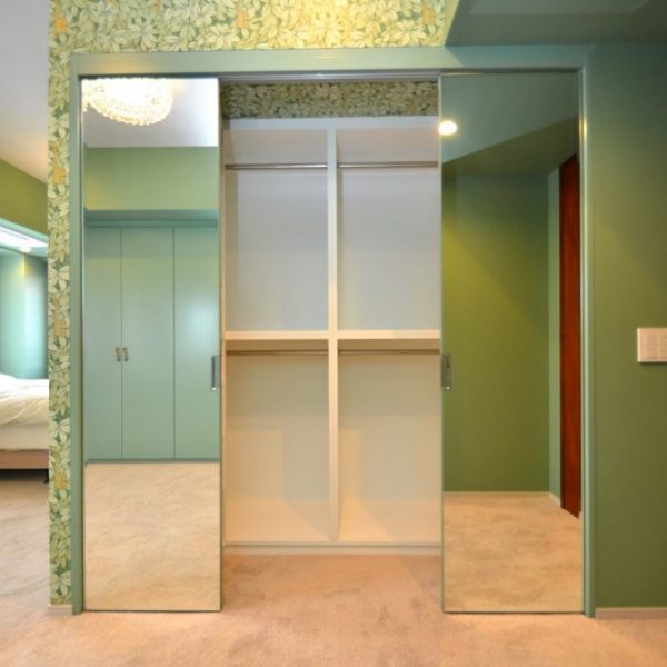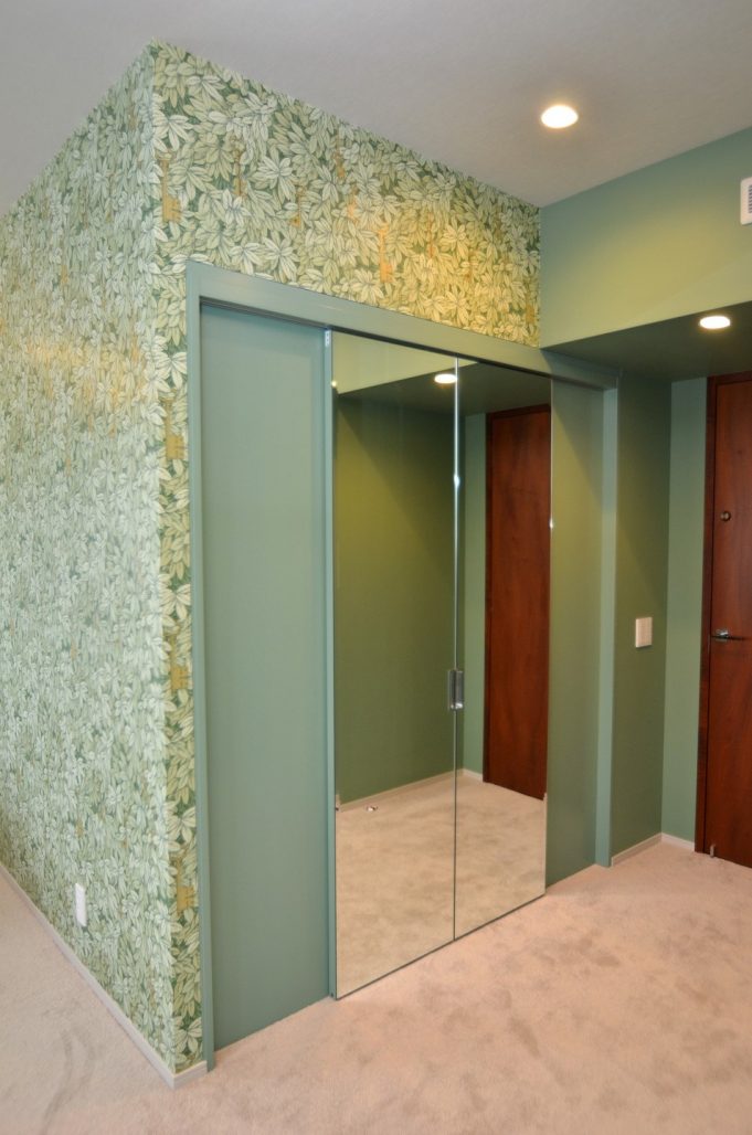 引き分け扉に対し、面取り加工を施した大型の姿見を練り付け製作。