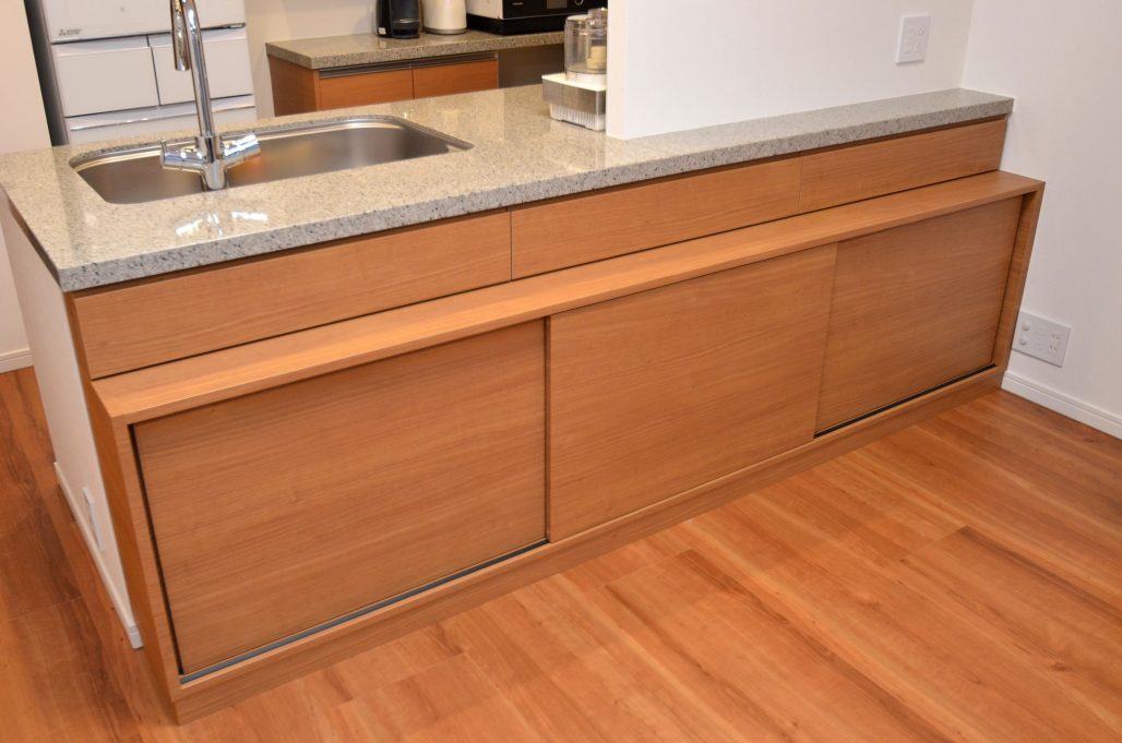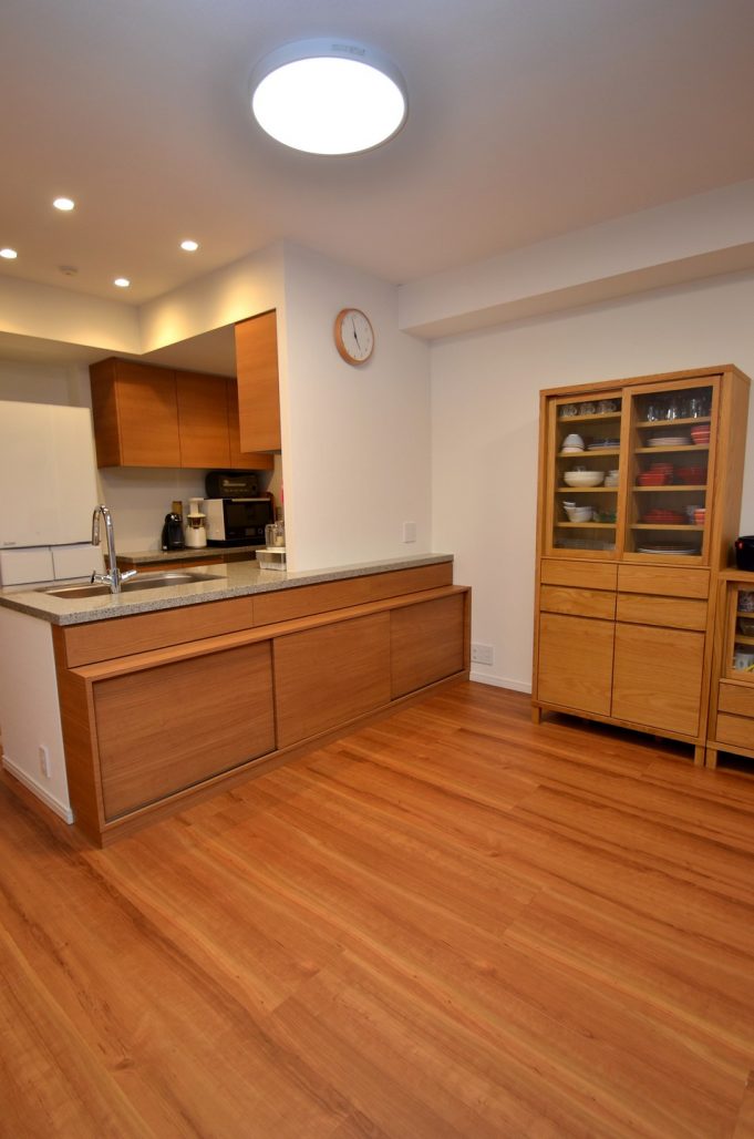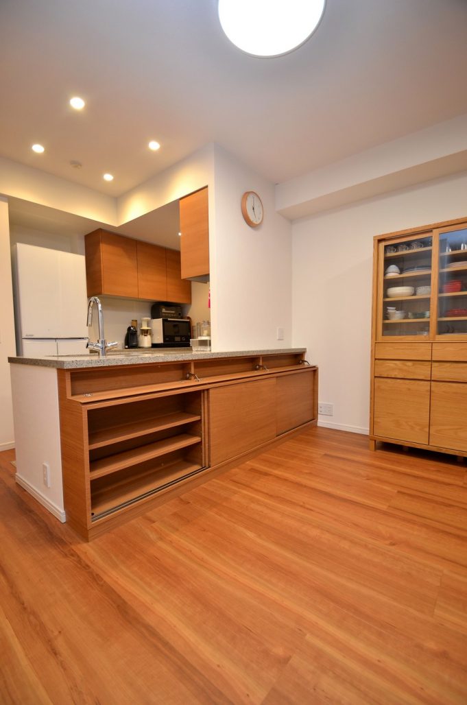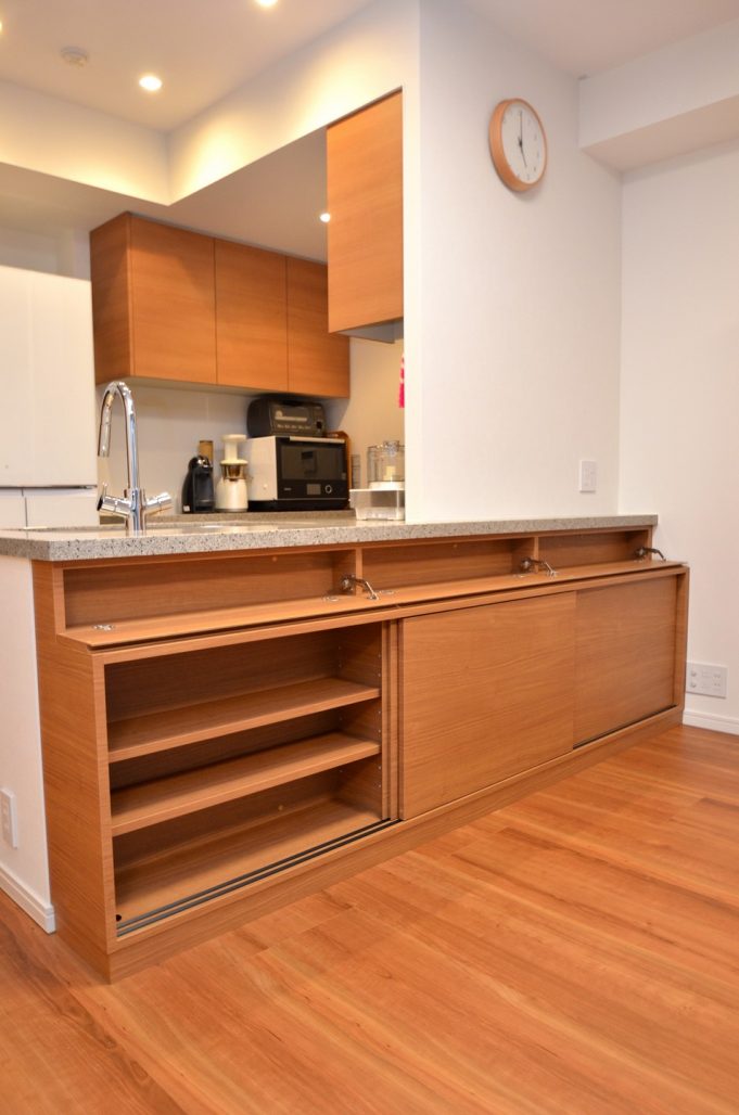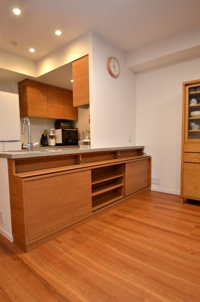 分譲マンション内 LDKにおける実装カウンター下収納製作事例/家具工事 オーダー家具 製作記録