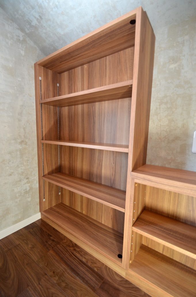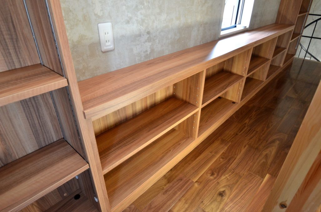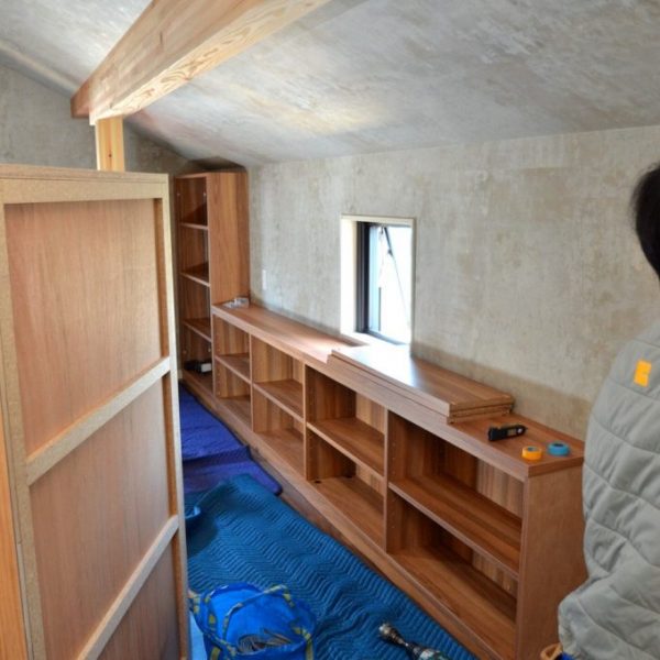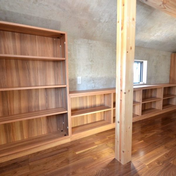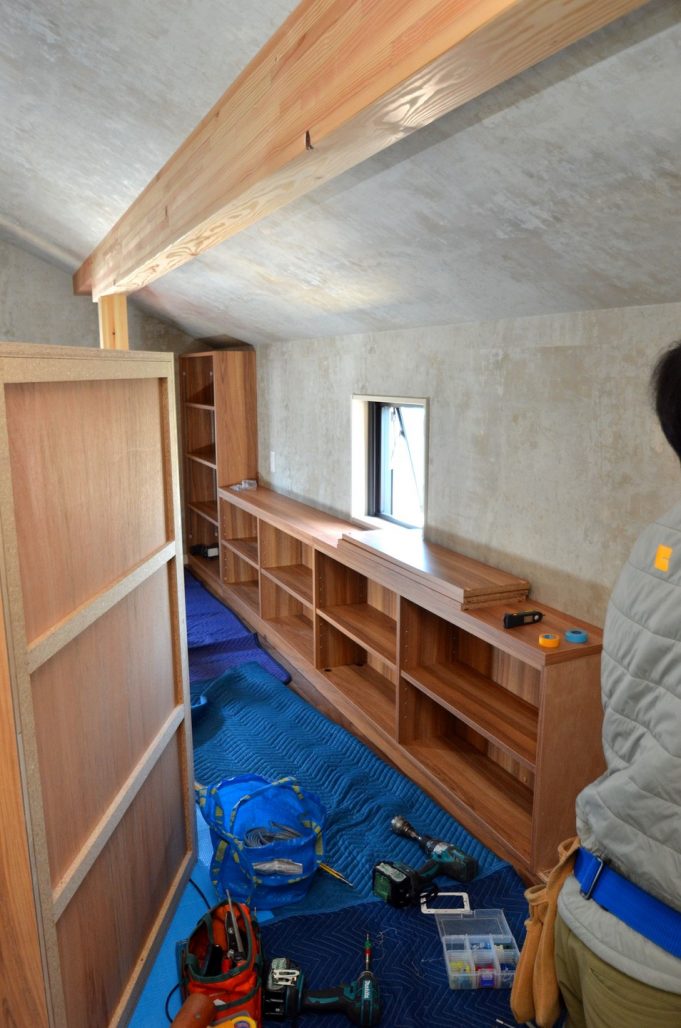 今回ご依頼をいただいた作業内容は、2Fリビングルームの壁面収納とロフト階のブックシェルフ工事一式。