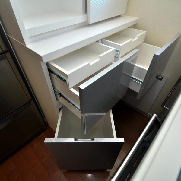 今回のカップボードの特徴は、アウトセット形状でのスライド扉と2重構造の抽斗です。