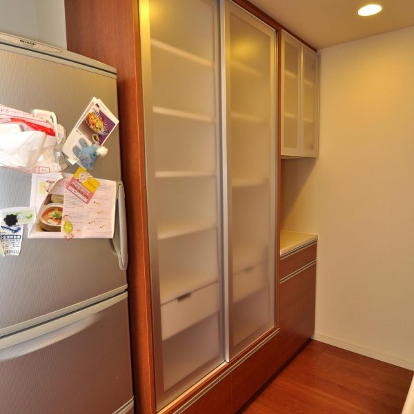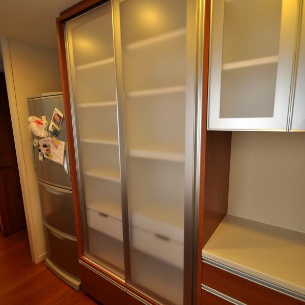 今回の食器棚の特徴は、左手トールタイプの引戸収納でしょうか。