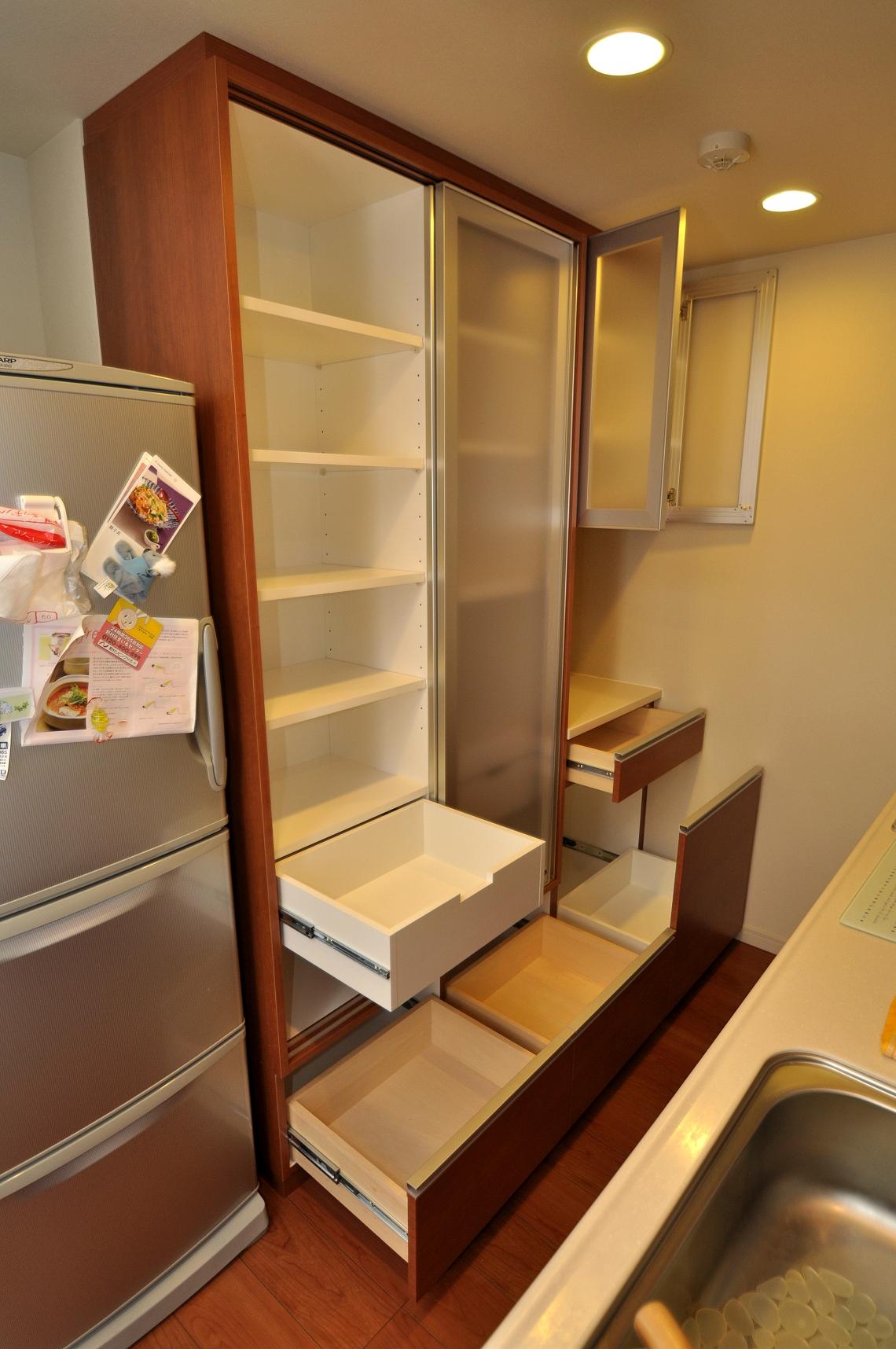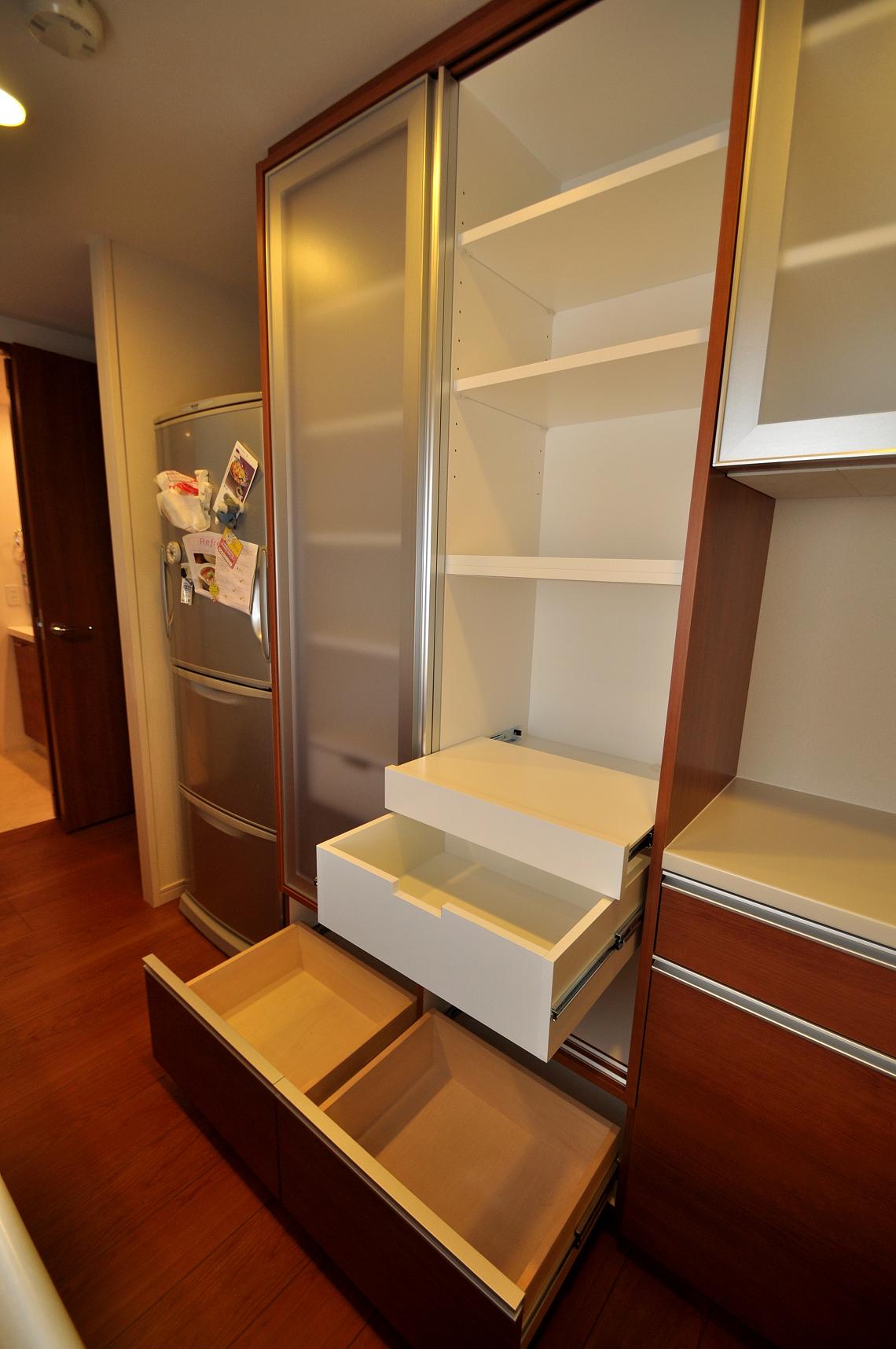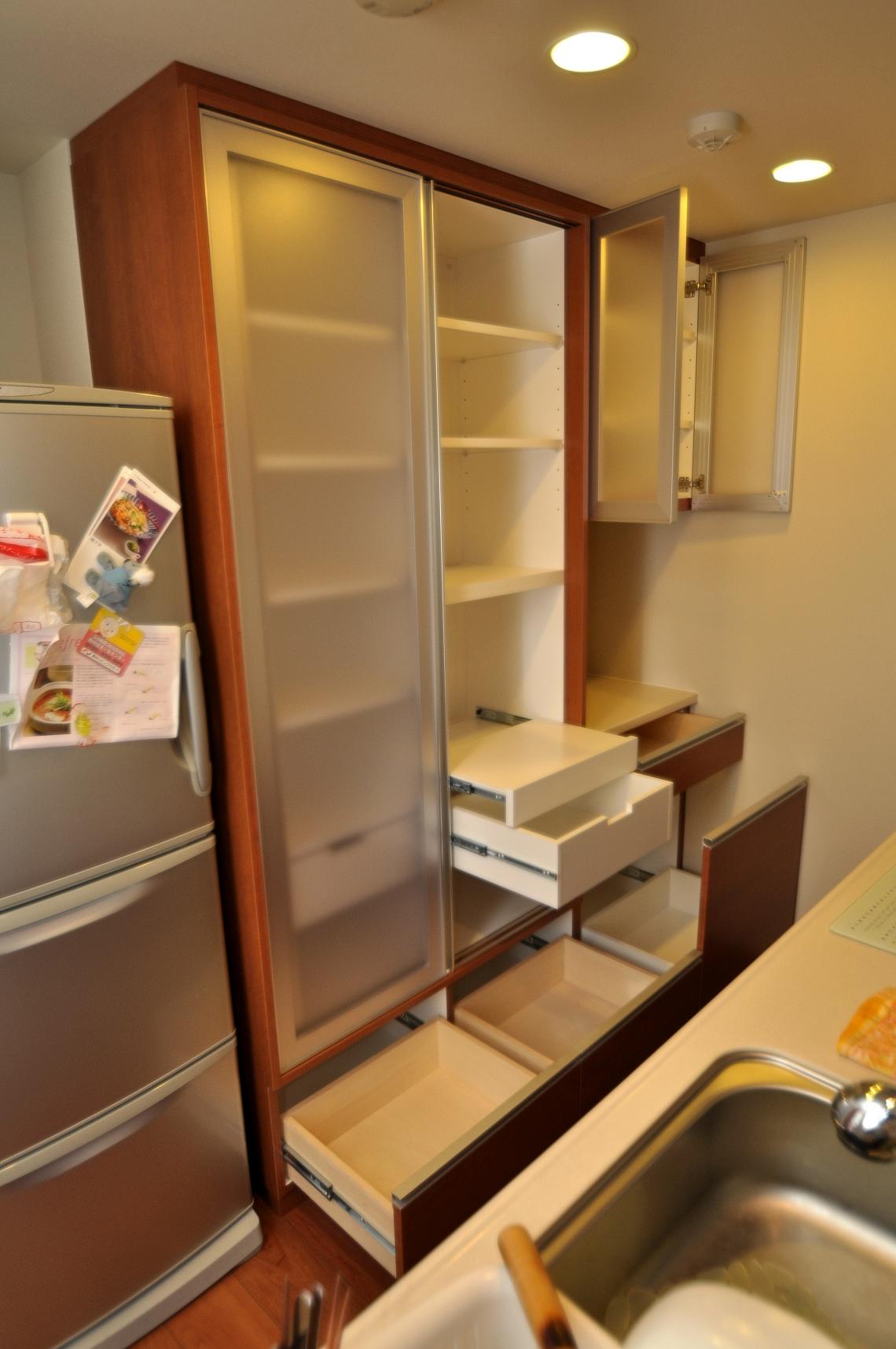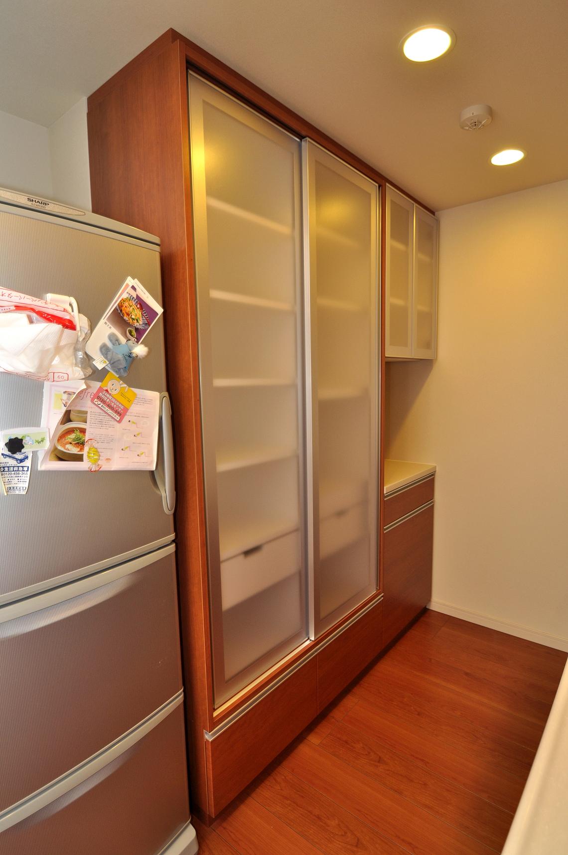 今回の食器棚の特徴は、左手トールタイプの引戸収納でしょうか。