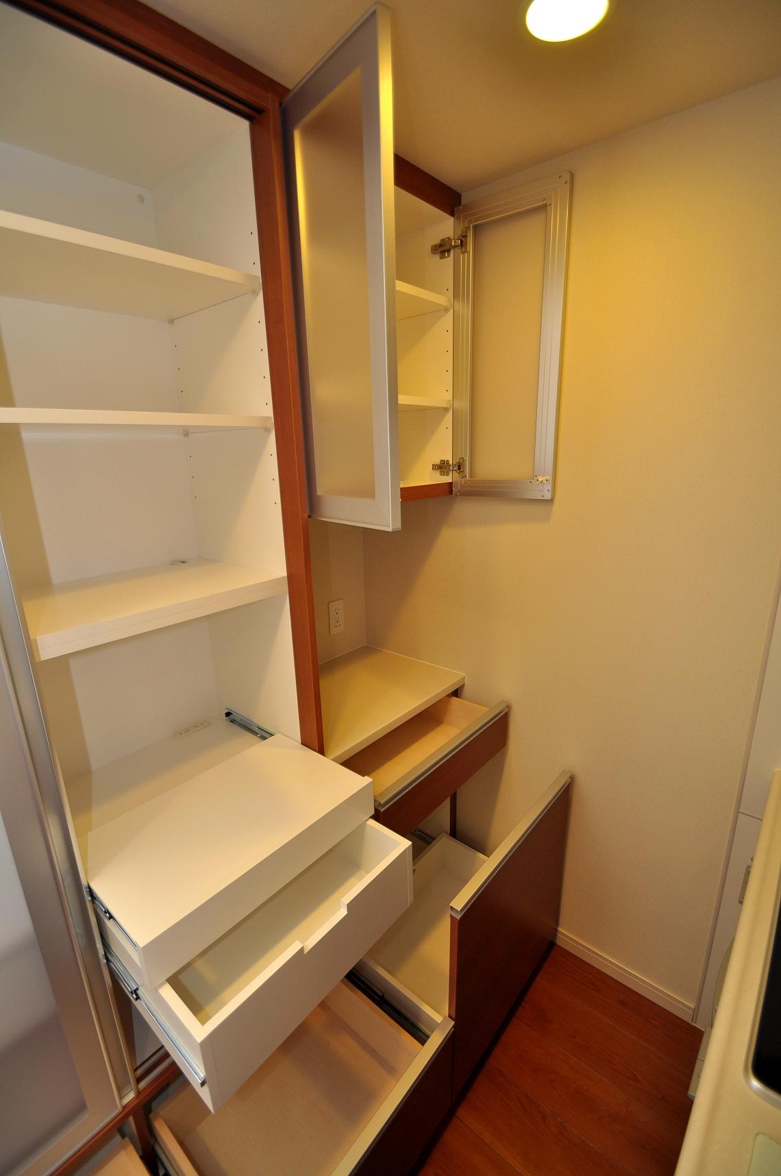 引戸収納内部には、抽斗を2杯・芯出し(スライド天板)を1箇所他可動棚板の構成。