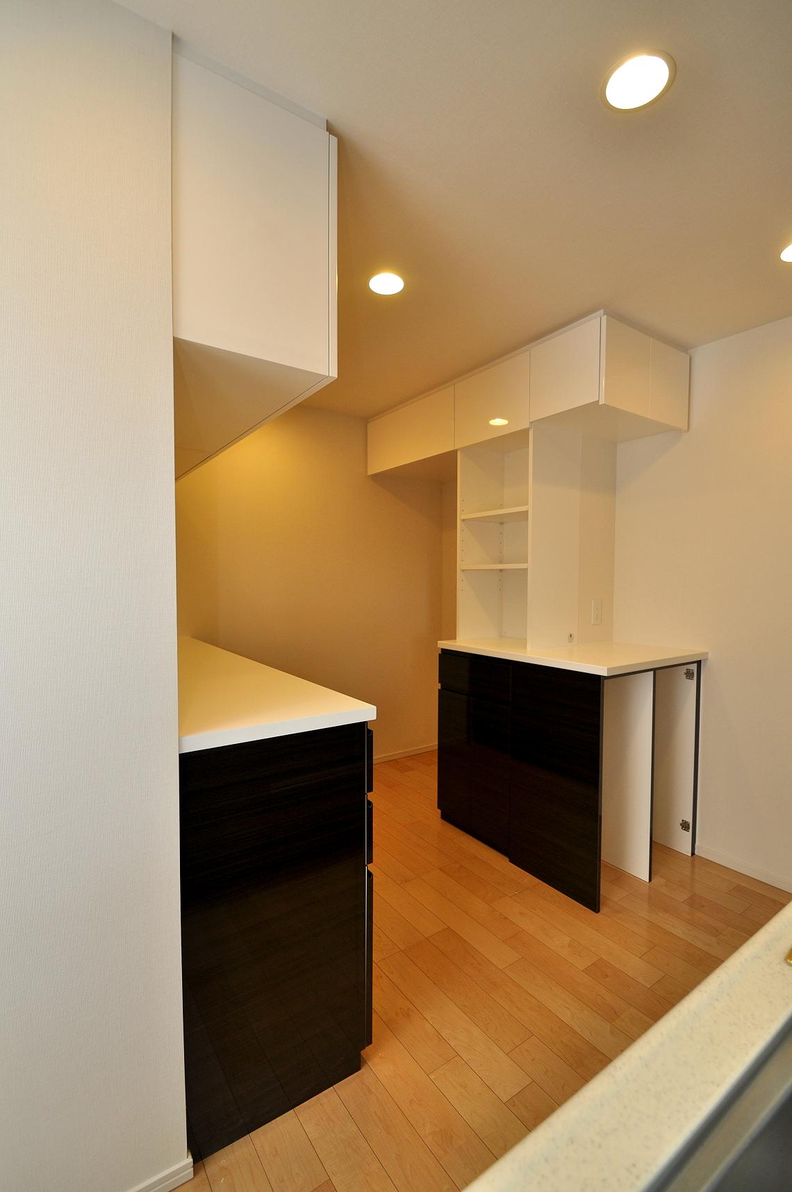 今回のキッチン収納の特徴は、上下の色分けによる圧迫感の緩和と、