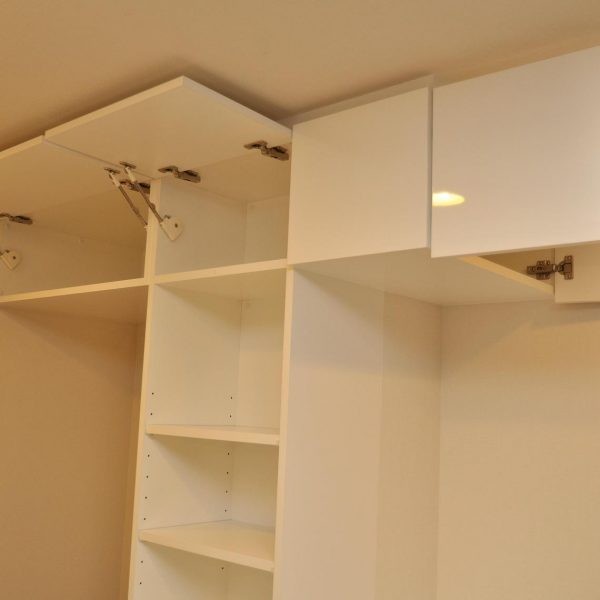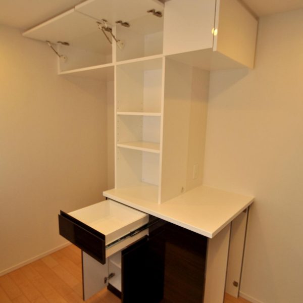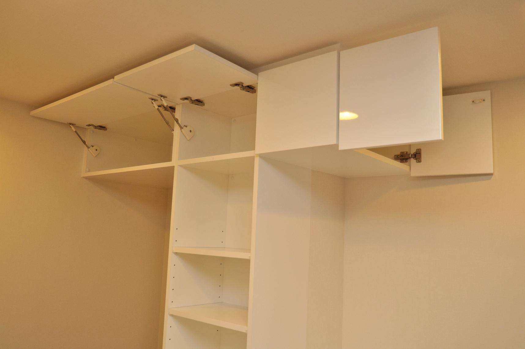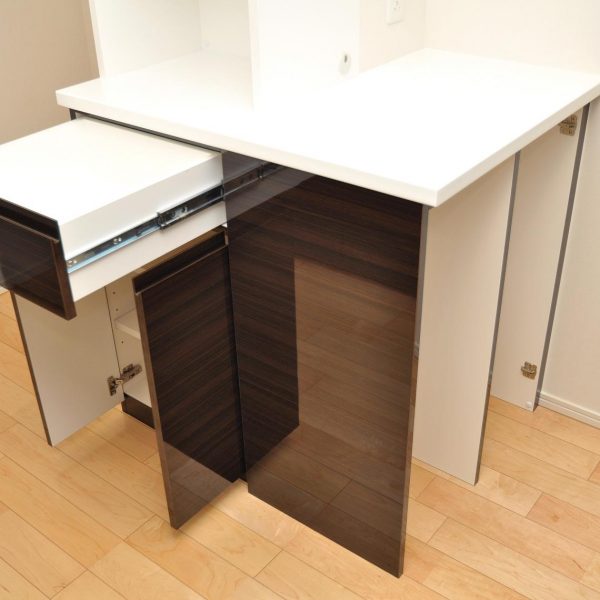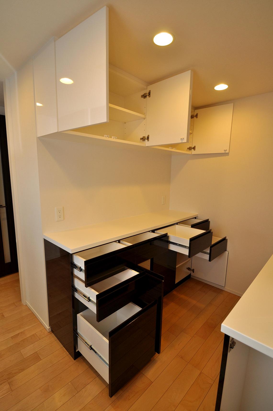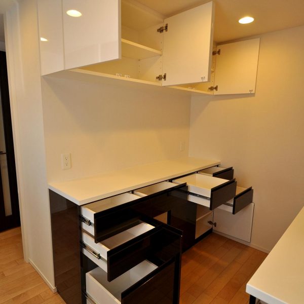 R側のL型タイプはスイングアップ扉・抽斗・開き戸収納の複合タイプ。