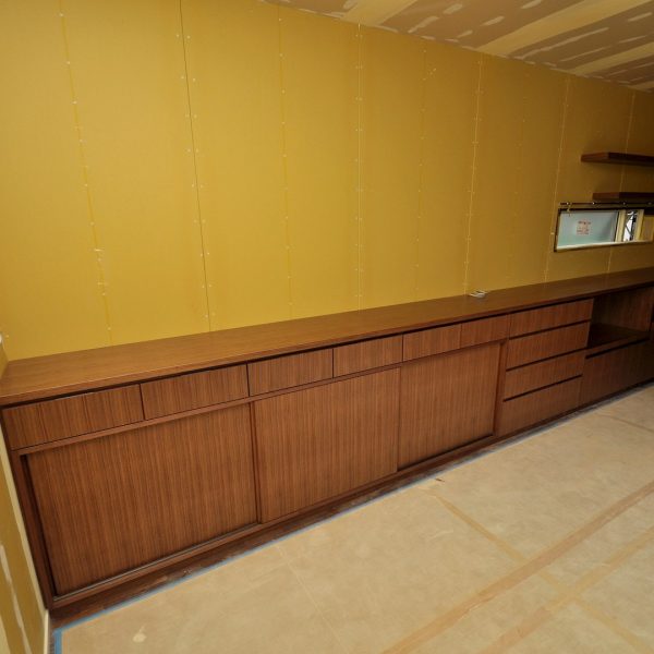 空間全体の色味・質感をそろえる為、必要枚数+αの突板材製作からスタート。