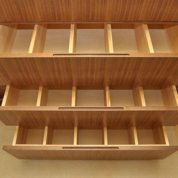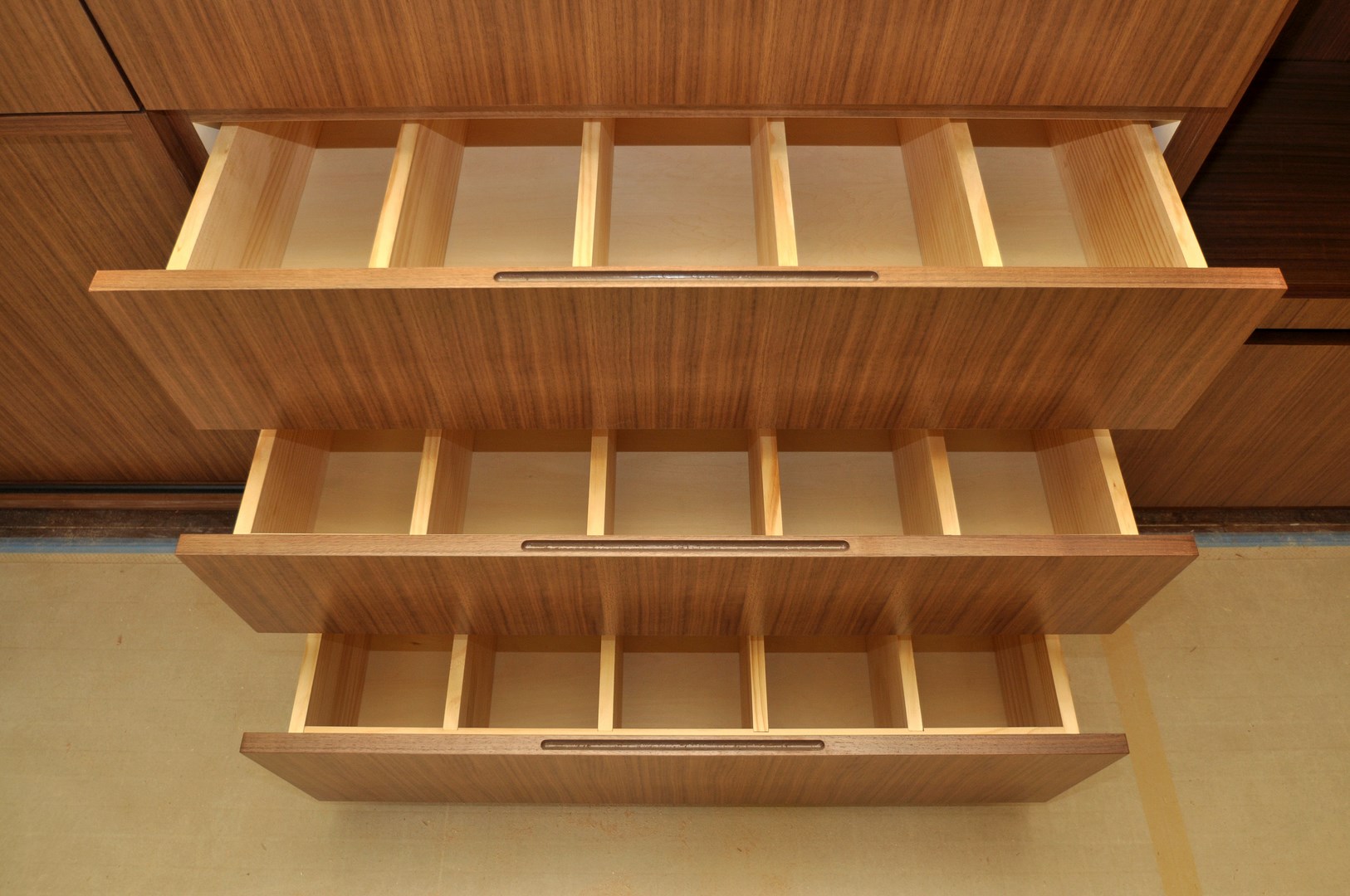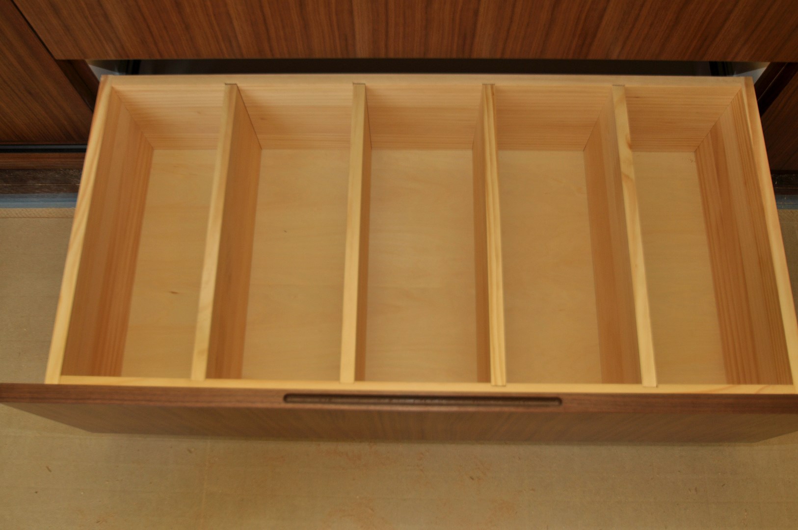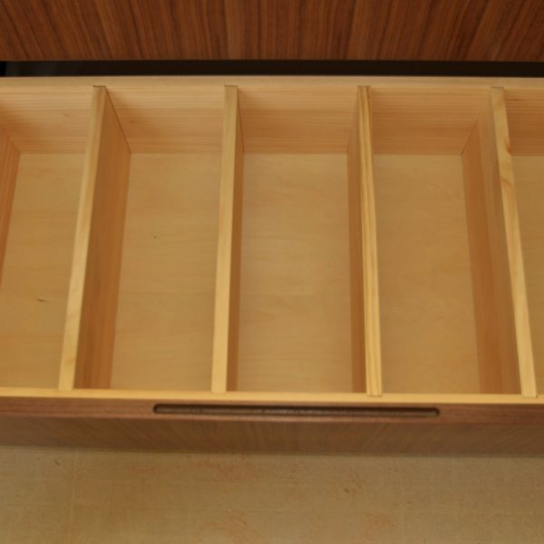 引き出し内部にはパイン無垢集成材を採用した着脱式分割加工など、