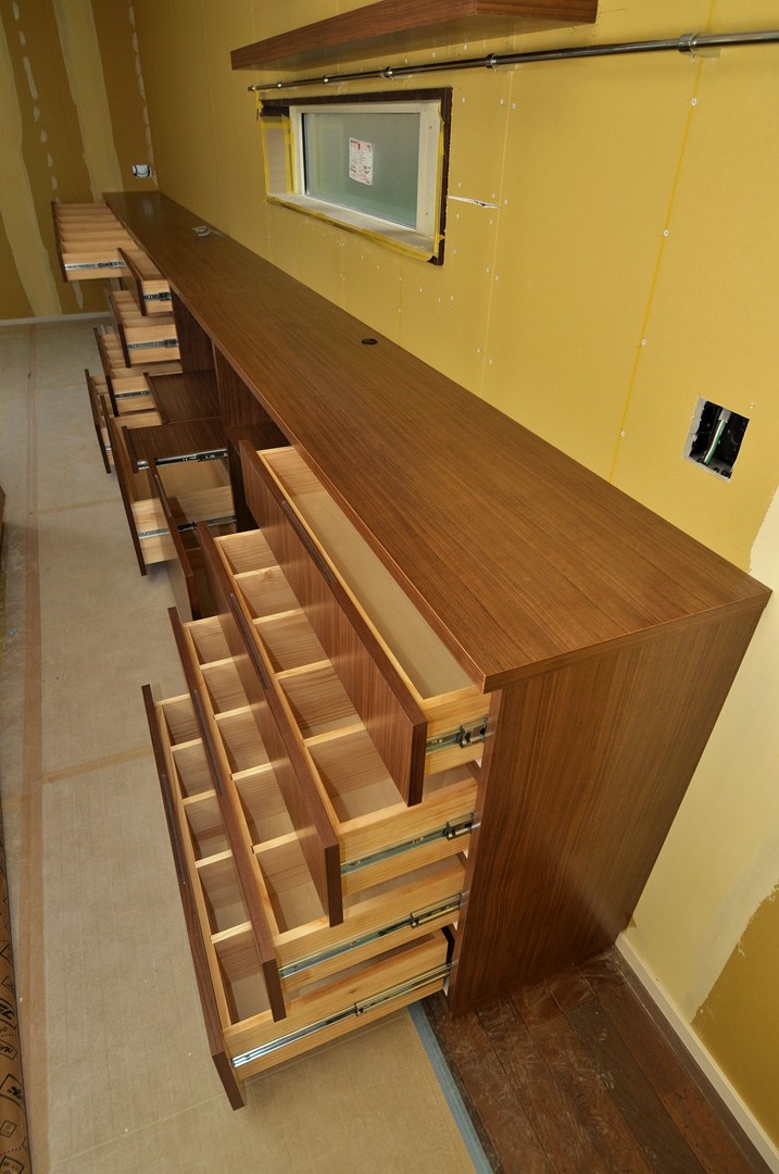 オープンキッチンよりの収納は、キッチン収納を重視した抽斗メインの割付。