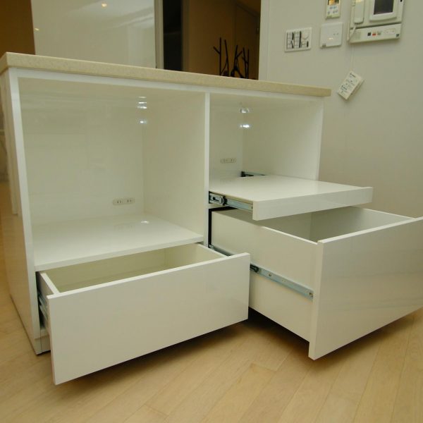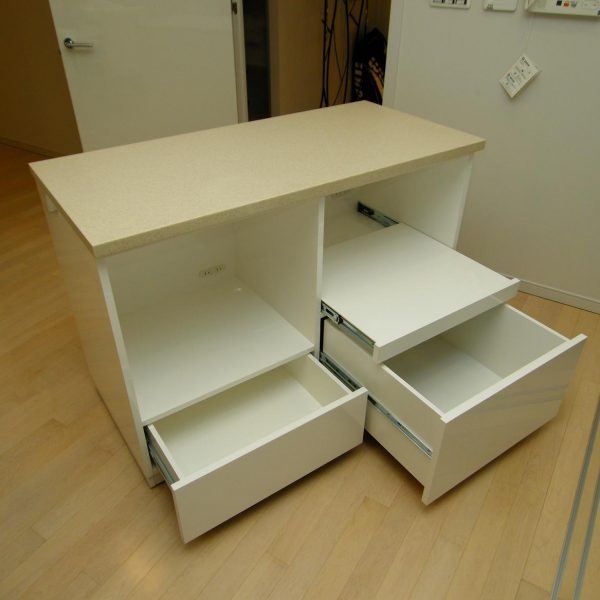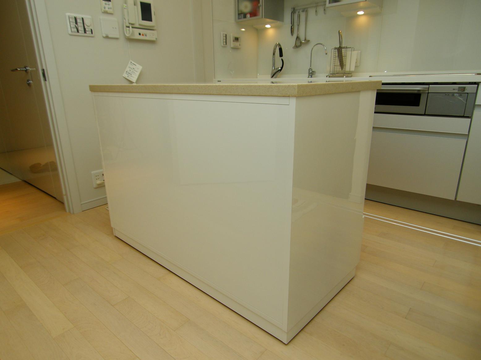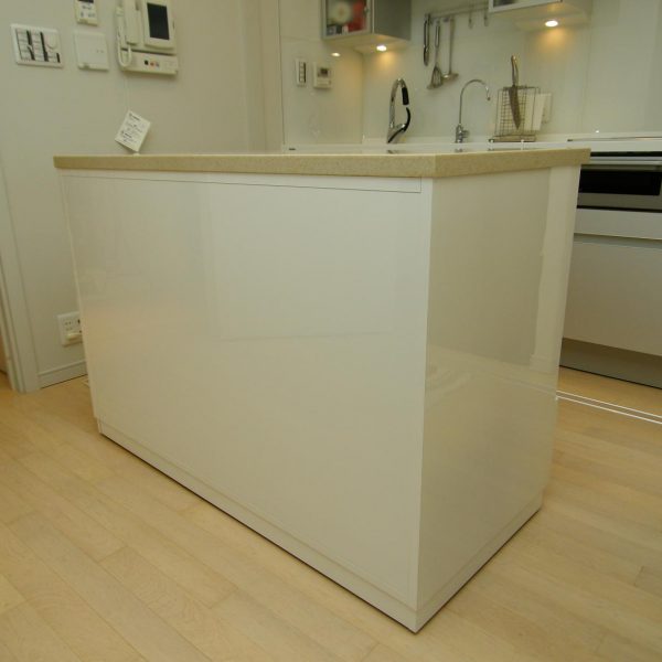 依頼内容は建具との色合わせした面材(白色鏡面)のアイランドカウンター。