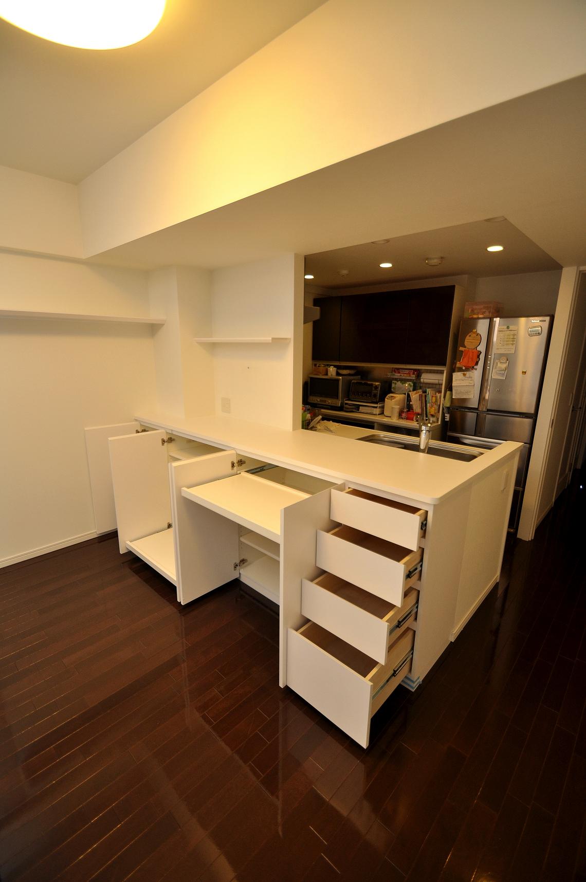 既存カウンターの奥行きでは収納容量に不満があるといったことから、