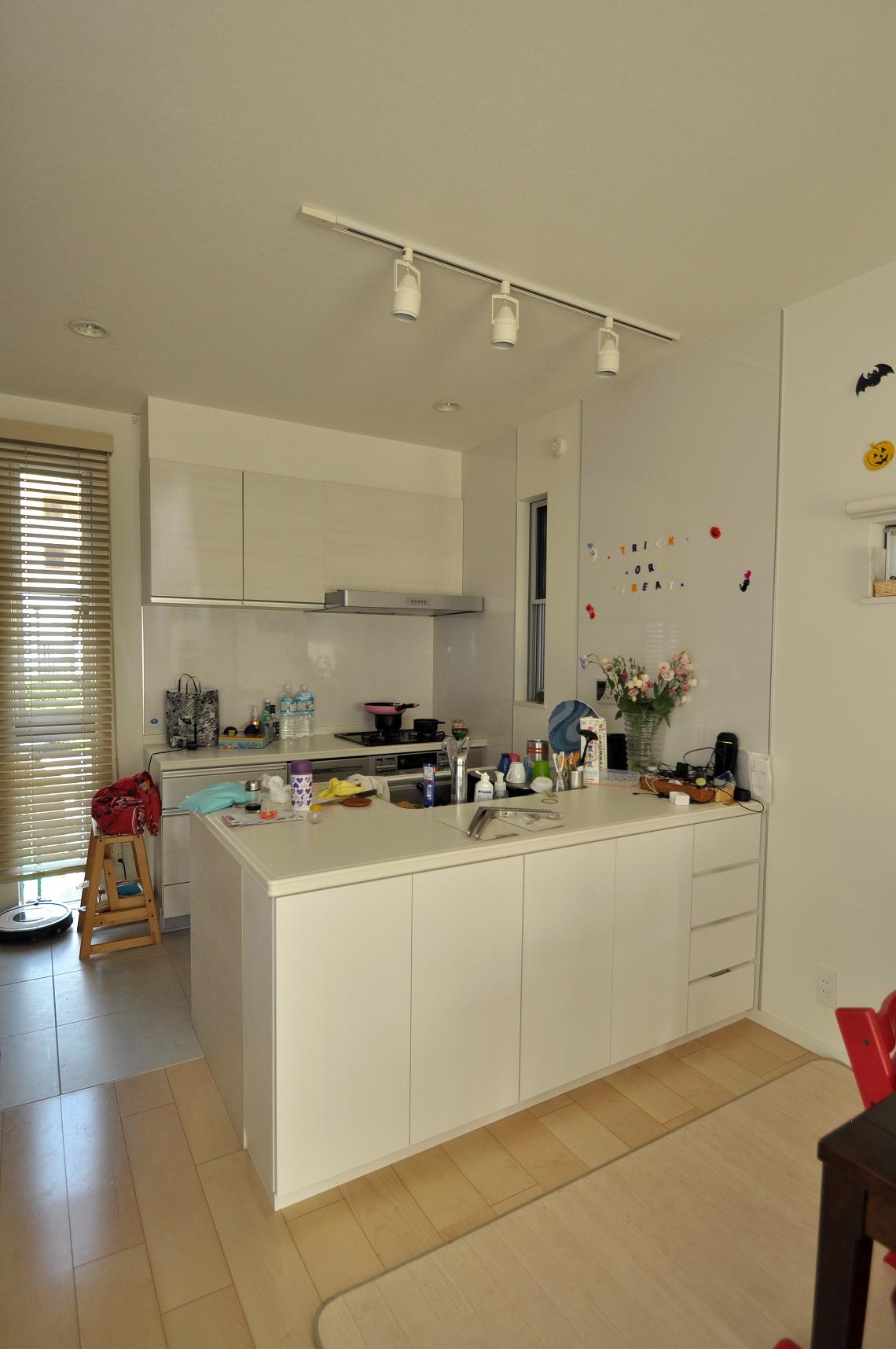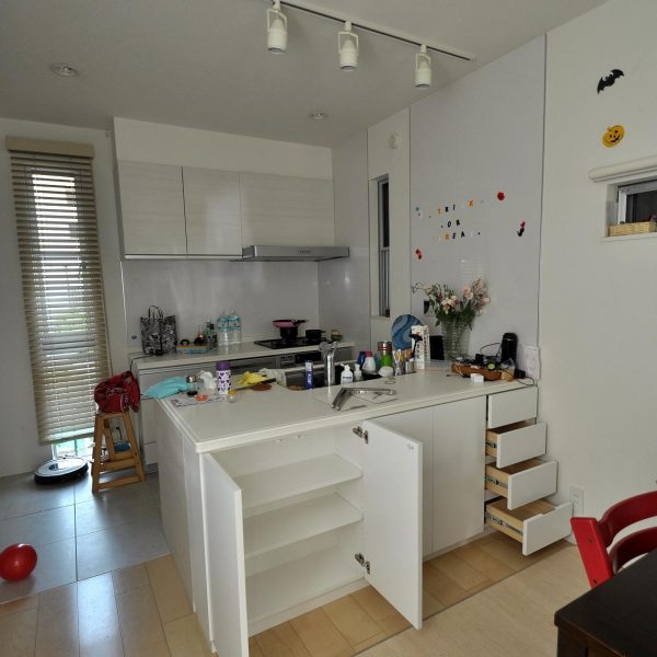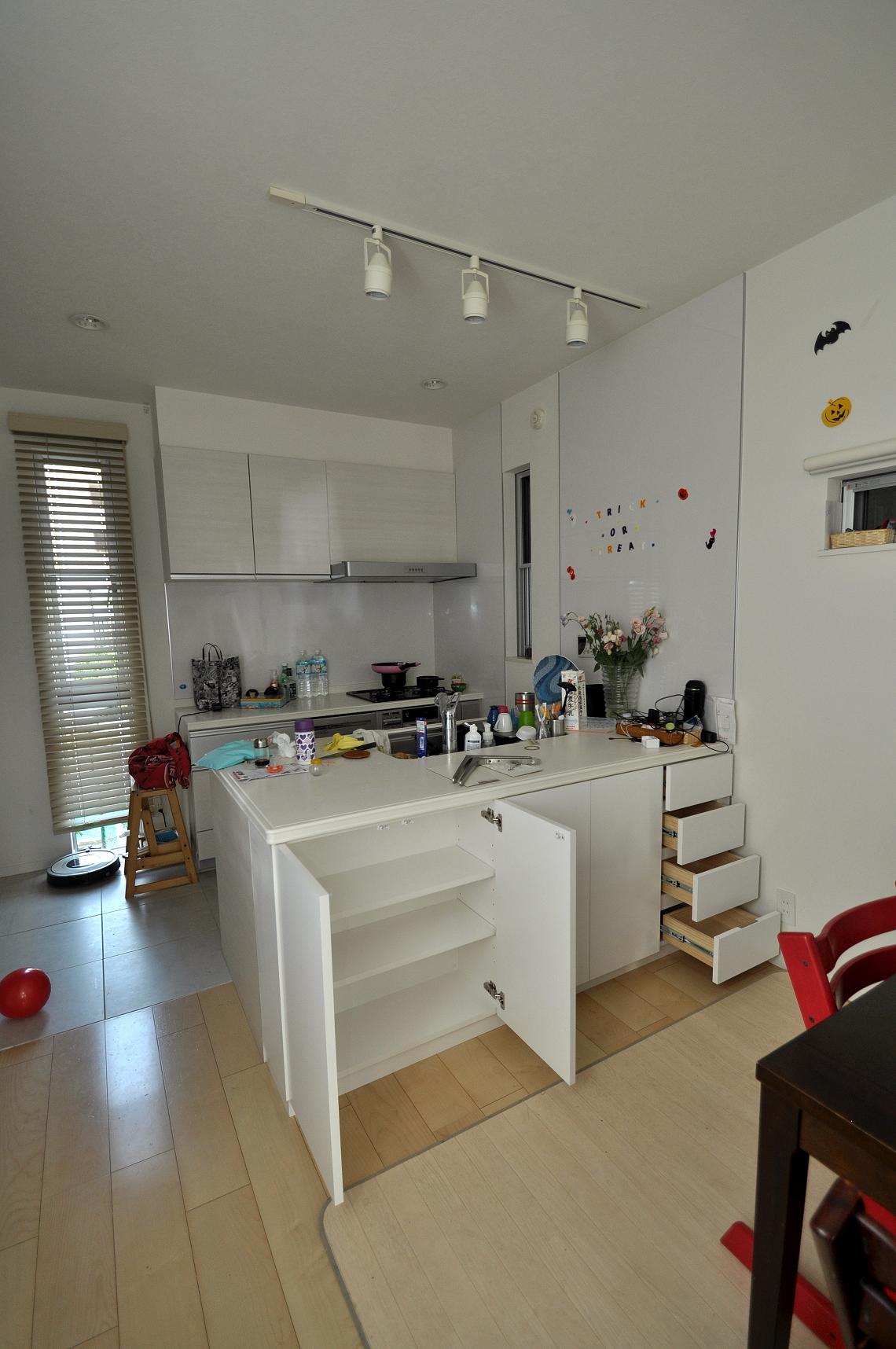 オープンキッチンのデッドスペースが収納スペースとなり、