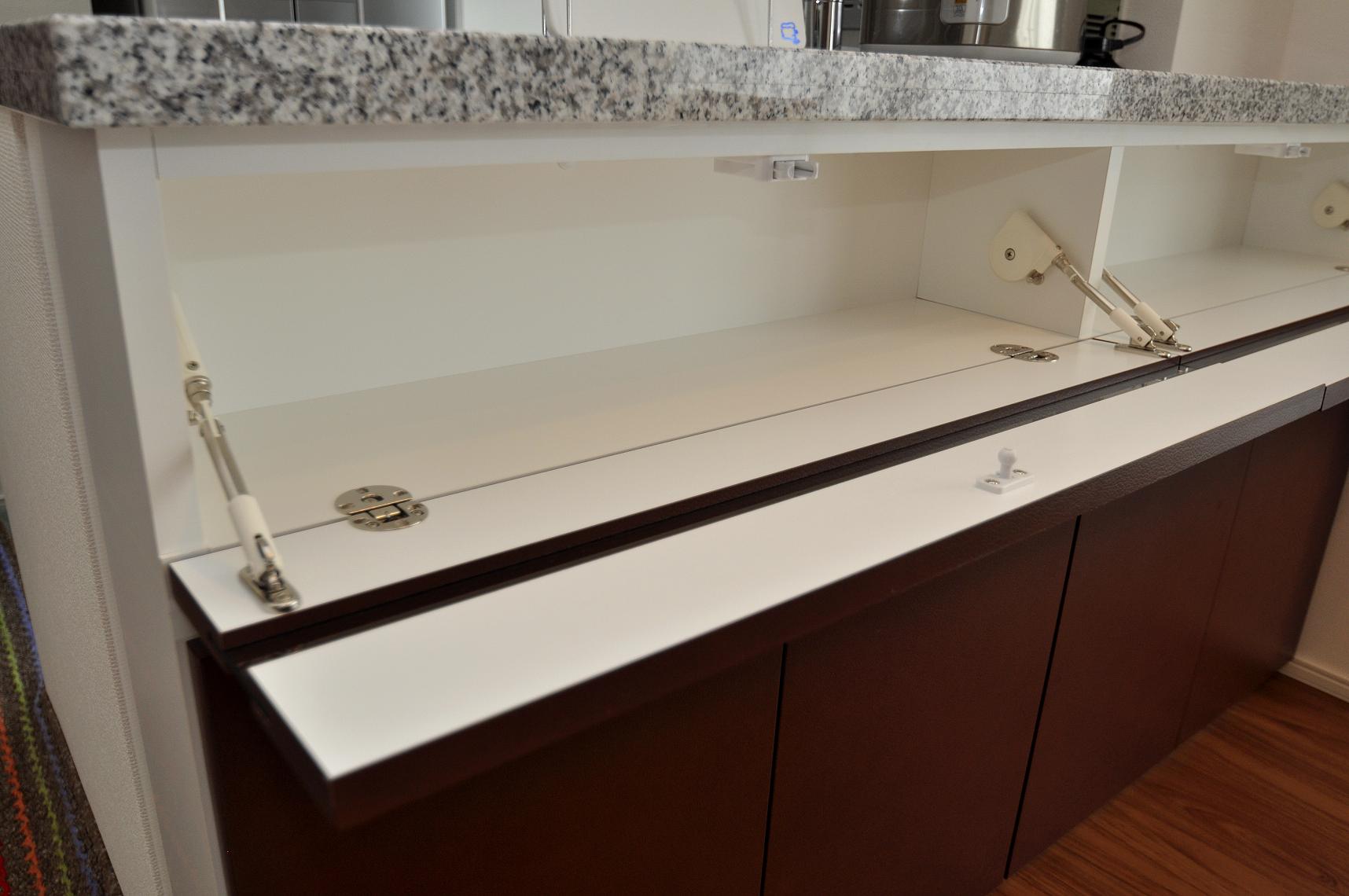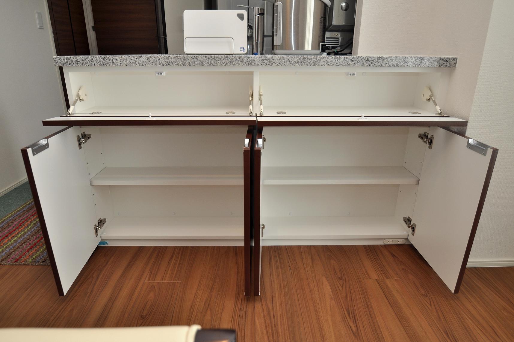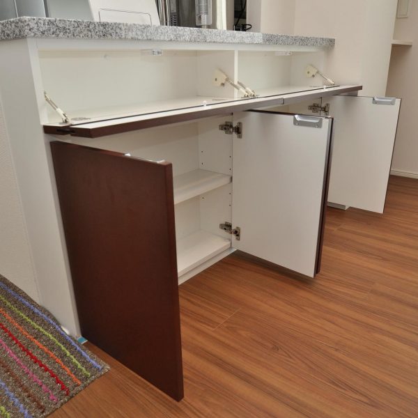 奥行き寸法の関係でプッシュダウン扉と開き戸で構成させていただきました。