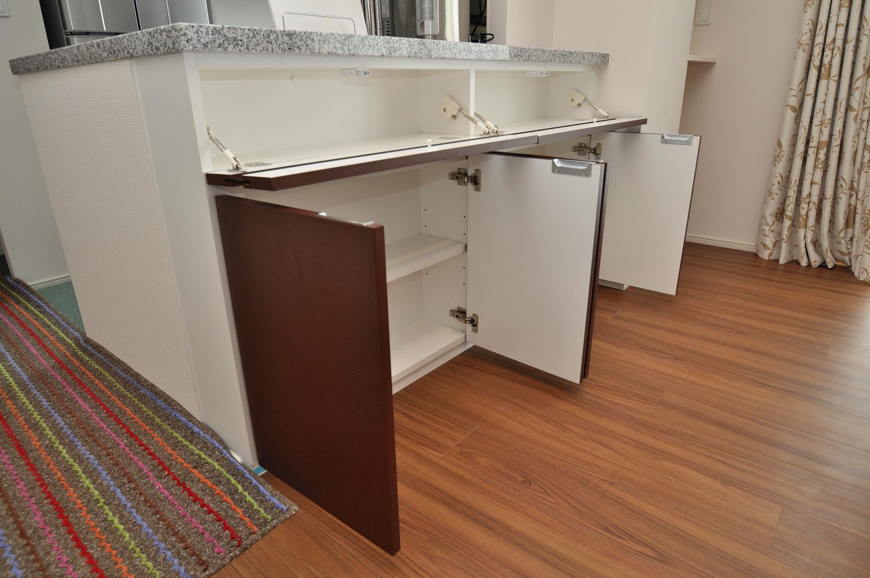 カウンター下収納もワンフレームに納まるキッチン収納との色あわせにて製作。