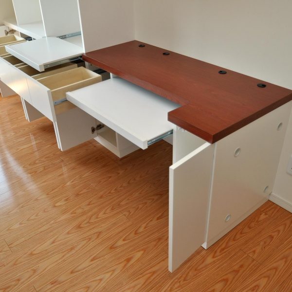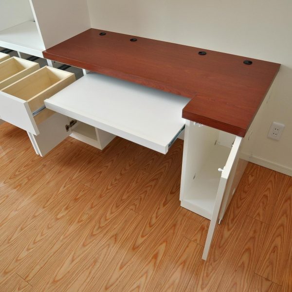 今回のリビングボードの特徴は扁平を掛けたPCデスク。